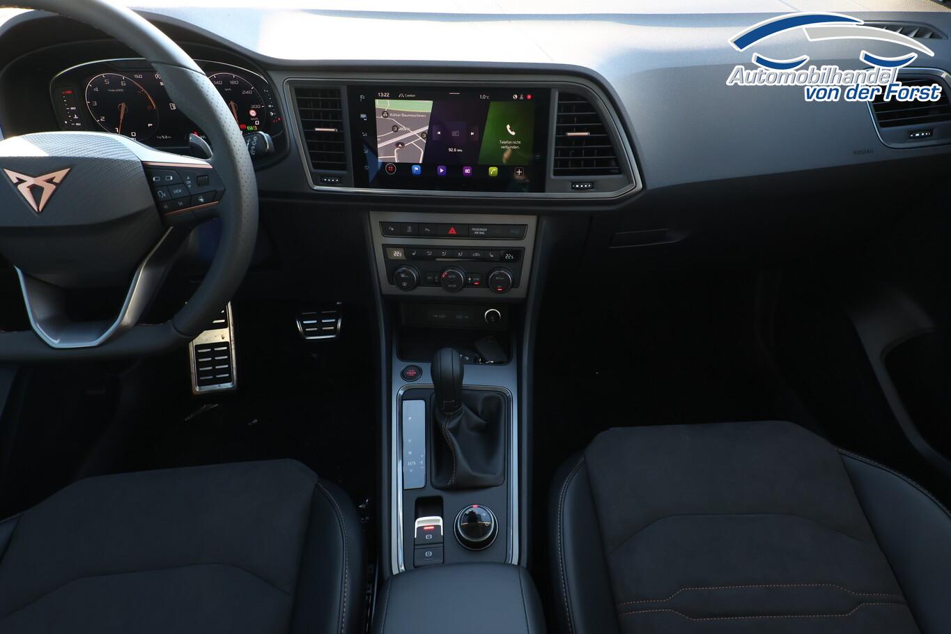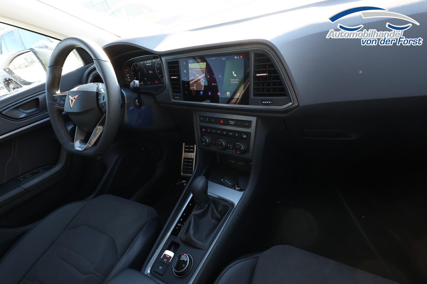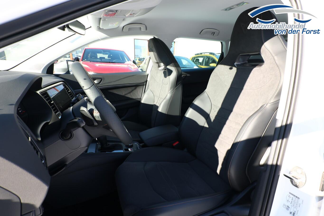 Winter-Paket (Sitzheizung vorn), Reserverad als Notrad, 8 Lautsprecher, Anschlussgarantie: 3 Jahre oder 100.000 km, Audio-Navigationssystem mit 9,2 Zoll Farb-Touchscreen, Bremssättel Schwarz, Dachhimmel Grau, Dachspoiler, Diebstahlsicherung Radschrauben, Fahrassistenz-System: Autom. Distanzregelung (ACC / PCC) mit vorausschauender Geschw. - Regelung, Fahrassistenz-System: Fernlichtassistent, Fensterzierleisten Schwarz, Gepäckraumbeleuchtung LED, Handschuhfach abschließbar, Innenelemente: Dekoreinlagen Aluminium gebürstet, Lenkrad unten abgeflacht, LM-Felgen 19 Zoll (Exclusive Silver/Schwarz), Radioempfang Digital (DAB), Reifen 235/40 R19, Schadstoffarm nach Abgasnorm Euro 6e (EU6EA), Sicherheitsgurt-Kontrollsystem, Sitzbezug / Polsterung: Dinamica Velours/Kunstleder, Sprachsteuerung, Stau-/Ablagefach unter Sitz vorn rechts, Stoßfänger Sport, USB-Schnittstelle vorn (2-fach, Typ C), Licht- und Sicht-Paket (Innenspiegel mit Abblendautomatik / Licht- und Regensensor / Lichtassistent (Coming Home, Leaving Home)), Bluetooth-Schnittstelle mit Freisprecheinrichtung integriert (Bluetooth Audio-Streaming), Scheinwerfer Voll-LED (Leuchtweitenregelung automatisch), Ablagetasche an Vordersitzlehnen, Ambiente-Beleuchtung LED, Brillenfach, Einstiegsleisten (Aluminium) vorn, beleuchtet, Fußraumbeleuchtung LED, Handschuhfach mit LED-Beleuchtung, Karosserie: 5-türig, Kombiinstrument digital (virtual cockpit), Lendenwirbelstütze Sitz vorn links, verstellbar, Lendenwirbelstütze Sitz vorn rechts, verstellbar, Mittelarmlehne hinten, Mittelkonsole vorn mit Mittelarmlehne, Becherhalter, Ablagebox und Luftausströmer hinten, Mobile Online Dienste Cupra Connect plus, Motor 1,5 Ltr. - 110 kW 16V TSI ACT, Otto-Partikelfilter (OPF), Parkbremse elektrisch, Pedale Aluminium-Design, Radstand 2681 mm, Sitz vorn links höhenverstellbar, Sitz vorn rechts höhenverstellbar, Sonnenblende links mit Spiegel (beleuchtet), Sonnenblende rechts mit Spiegel (beleuchtet), Stau-/Ablagefach unter Sitz vorn links, Steckdose (12V-Anschluß) vorn, Full Link (MirrorLink, Apple CarPlay und Android Auto), USB-Ladeanschlüsse (2-fach, Typ C) für 2.Sitzreihe, Antriebsart: Frontantrieb, Elektron. Differentialsperre (XDS), Elektron. Stabilitätskontrolle (ESC), Wegfahrsperre (elektronisch), Getriebe 7-Gang - Doppelkupplungsgetriebe DSG, Klimaanlage Climatronic 2-Zonen, Airbag Beifahrerseite abschaltbar, Airbag Fahrer-/Beifahrerseite, Fensterheber elektrisch vorn + hinten mit Komfortschaltung, Isofix-Aufnahmen für Kindersitz an Rücksitz, Knieairbag Fahrerseite, Kopf-Airbag-System, Rücksitzlehne geteilt/klappbar (1/3-2/3), Schließ-/Startsystem Kessy, Seitenairbag, Seitenscheiben hinten und Heckscheibe abgedunkelt, Sport-Schalensitze vorn mit integrierten Kopfstützen, Zentralverriegelung mit Fernbedienung, Bordcomputer, Fahrassistenz-System: Fahrprofilauswahl (CUPRA Drive Profile), Dachreling schwarz, Fahrassistenz-System: Verkehrszeichenerkennung, Notrufsystem, Lenkrad heizbar (Sport/Leder) mit Multifunktion und Schaltfunktion, Servolenkung elektro-mechanisch, Außenspiegel elektr. verstell-, heiz- und anklappbar mit Spiegelabsenkung und Welcome Light, Heckleuchten LED mit dynamischem Blinklicht, Nebelscheinwerfer LED mit Abbiegelicht, Fahrassistenz-System: Parklenkassistent mit Einparkhilfe vorn und hinten inkl. Rückfahrkamera, Fahrassistenz-System: Müdigkeitserkennung, Fahrassistenz-System: Spurhalteassistent, Fahrassistenz-System: Umfeldbeobachtungssystem (Front assist) mit City-Notbremsfunktion, Start/Stop-Anlage