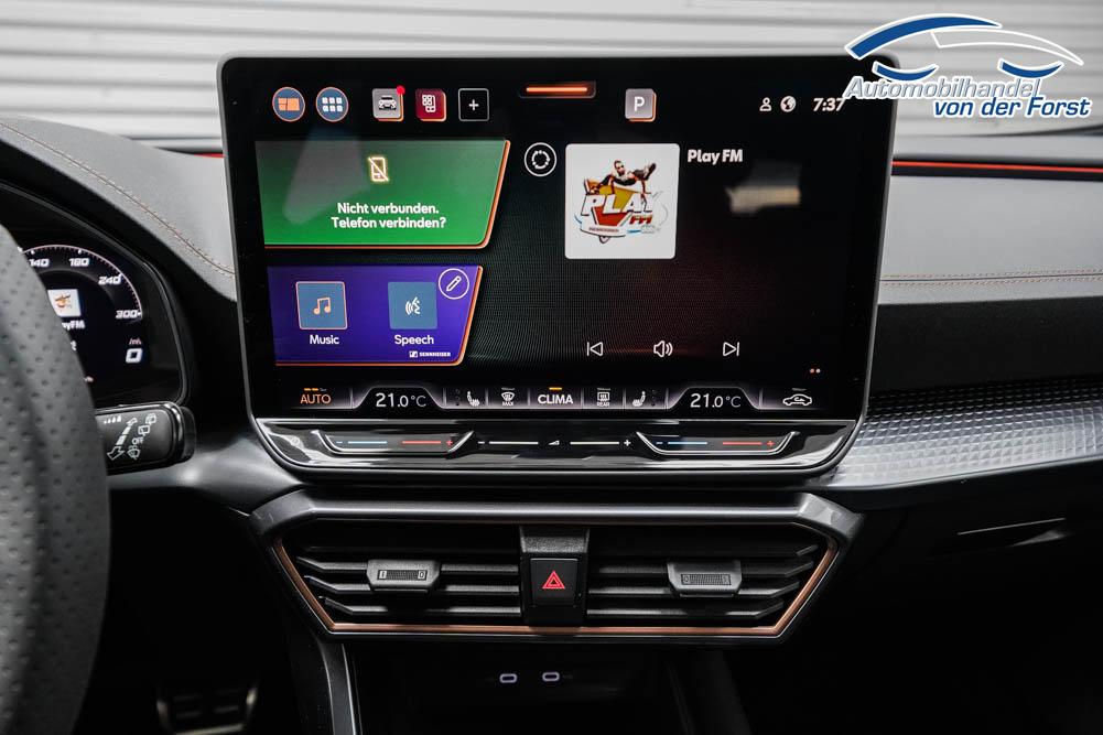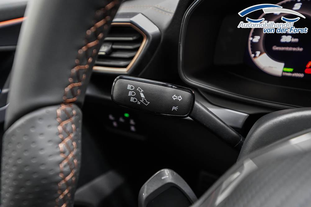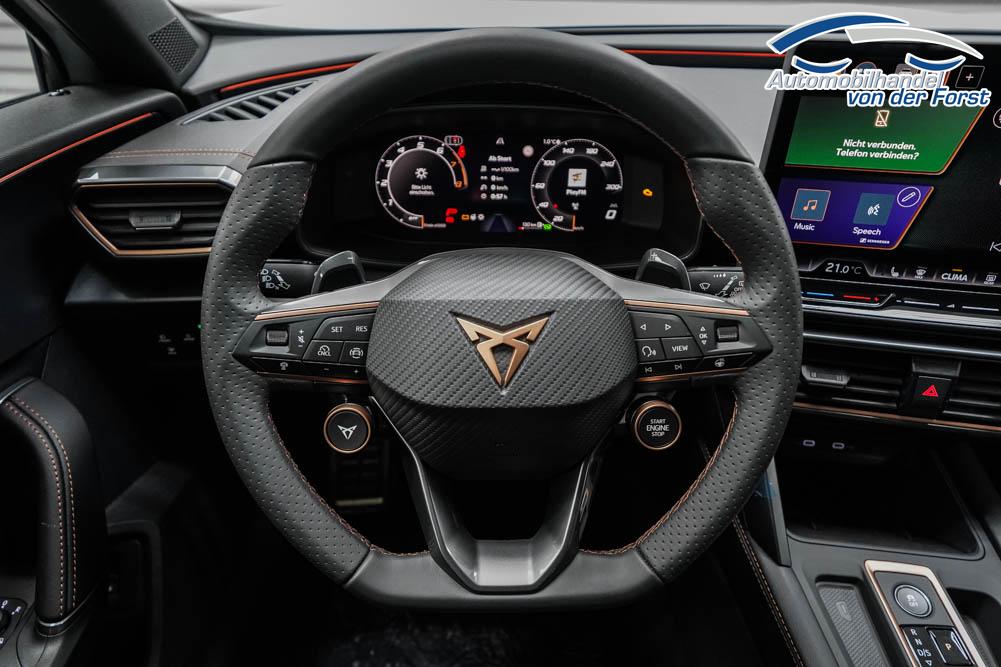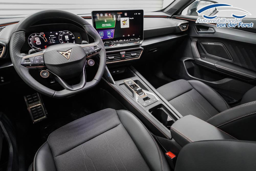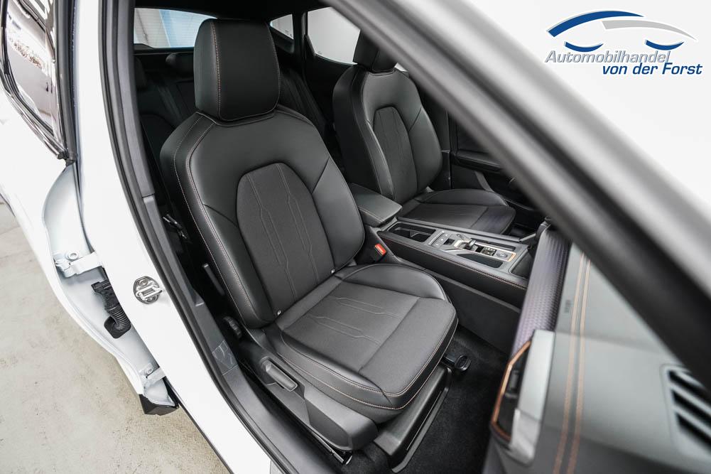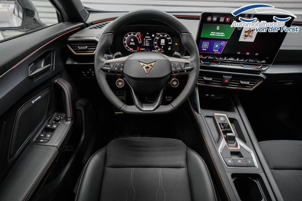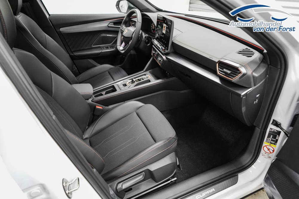 Beifahrersitz höhenverstellbar, Fahrersitz höhenverstellbar, Lederlenkrad, Lendenwirbelstütze, Mittelarmlehne vorne, Sitzbezug Stoff, geteilt umklappbare Rücksitzlehne, Lenkrad höhenverstellbar, Smart Wraparound Interieur Light, Beheizbares Lenkrad, Multifunktionslenkrad, Isofix, Isofix Beifahrersitz, abgedunkelte Scheiben, 18 Zoll Alufelgen , Dachreling schwarz, ABS, Alarmanlage, Außenspiegel elektrisch einstell-/anklappbar, Fensterheber elektrisch, Kopfairbags, Nebelscheinwerfer, Seitenairbags, Servolenkung, Sitzheizung, ESP, Wegfahrsperre, Außenspiegel beheizbar, Beifahrerairbag, Fahrerairbag, Parkpilot hinten, Parkpilot vorne, Reifendruckkontrolle, Regensensor, Lichtsensor, Digital Cockpit, Anhängekupplung schwenkbar, Tempomat Abstand ACC, Spurhalteassistent, Verkehrszeichenerkennung, LED-Scheinwerfer, Tagfahrlicht, Rückfahrkamera, Elektrische Heckklappe inkl. Virtual Pedal, KeylessEntry, StartStopSystem, Innenspiegel automatisch abbl., Müdigkeitswarnsystem, Notrufsystem, Schaltwippen, Klimaautomatik 3-Zonen, Geschwindigkeitsbegrenzer, Android Auto, Apple Carplay, Freisprecheinrichtung, Induktionsladestation, Sprachsteuerung, USB, Radio, Radio DAB, Bluetooth, Bordcomputer, IMMERSIVE by Sennheiser, Cupra Full Link, Full Link, variabler Ladeboden,