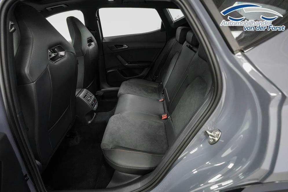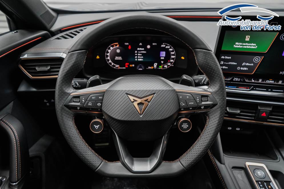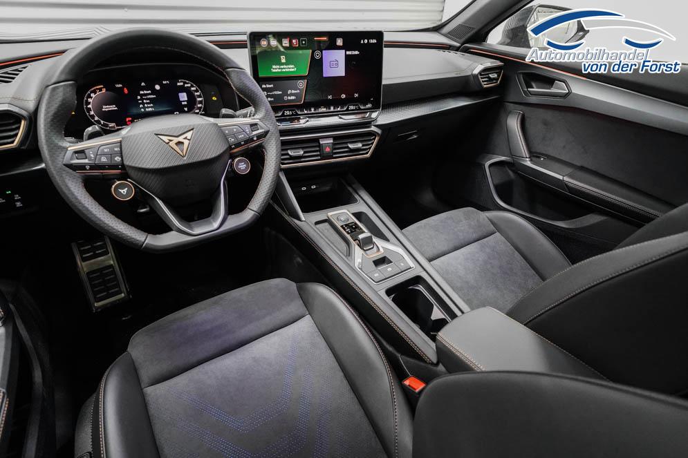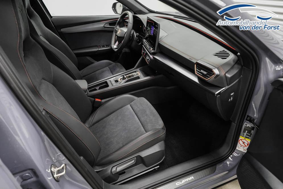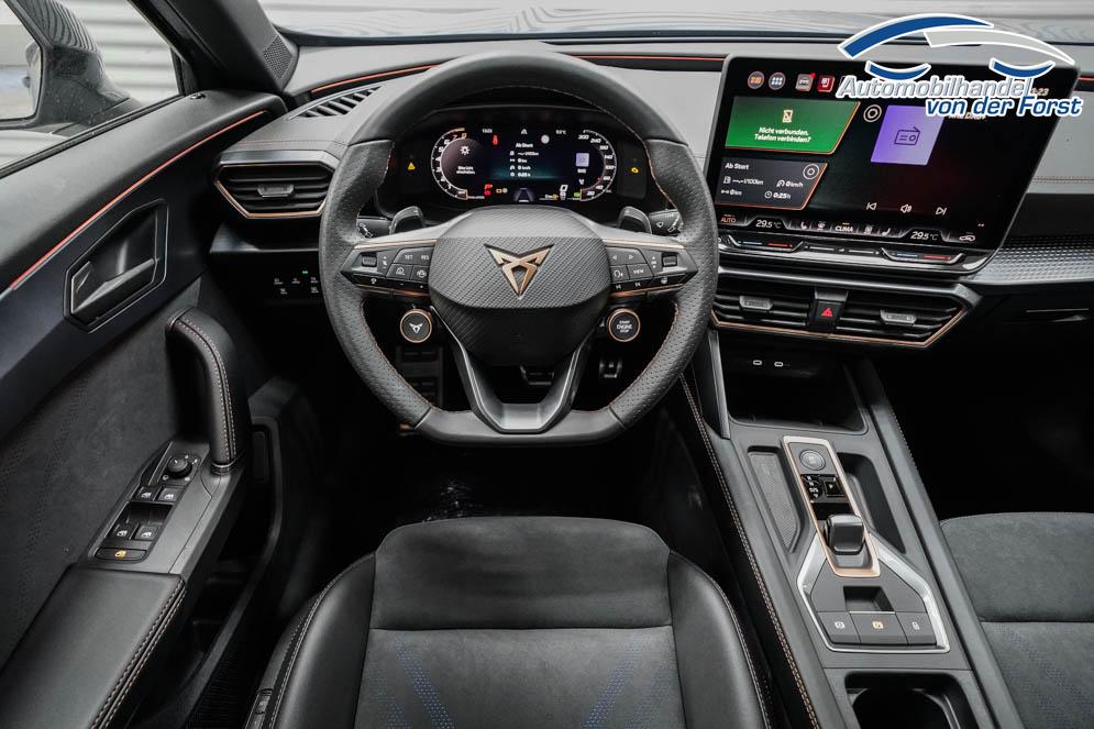 Beifahrersitz höhenverstellbar, Fahrersitz höhenverstellbar, Lederlenkrad, Lendenwirbelstütze, Mittelarmlehne vorne, Sportsitze, geteilt umklappbare Rücksitzlehne, Lenkrad höhenverstellbar, Sitzbezug Dinamica, Ambiente-Beleuchtung, Elektrisch verstellbarer Fahrersitz mit Memory, Beheizbares Lenkrad, Multifunktionslenkrad mit Satellitentasten, Isofix, Isofix Beifahrersitz, abgedunkelte Scheiben, 19 Zoll Alufelgen Sandstorm, Dachreling schwarz, ABS, Alarmanlage, Außenspiegel elektrisch, Fensterheber elektrisch, Kopfairbags, Nebelscheinwerfer, Schiebedach, Seitenairbags, Servolenkung, Sitzheizung vorne, DCC, ESP, Wegfahrsperre, Außenspiegel beheizbar, Beifahrerairbag, Fahrerairbag, Parkpilot hinten, Parkpilot vorne, Reifendruckkontrolle, Regensensor, Lichtsensor, Digital Cockpit, Anhängekupplung schwenkbar, Tempomat Abstand ACC, Fernlichtassistent, Spurhalteassistent, Verkehrszeichenerkennung, Full LED-Scheinwerfer, Tagfahrlicht LED, Pannenset, Rückfahrkamera, Panoramadach, Elektrische Heckklappe inkl. Virtual Pedal, KeylessEntry, StartStopSystem, Innenspiegel automatisch abbl., Müdigkeitswarnsystem, Notrufsystem, Schaltwippen, Klimaautomatik 3-Zonen, Geschwindigkeitsbegrenzer, Android Auto, Apple Carplay, Freisprecheinrichtung, Induktionsladestation, Sprachsteuerung, USB, Radio, Radio DAB, Bluetooth, Bordcomputer, Schalensitze vorne, Cupra Full Link, variabler Ladeboden, erweiterte Herstellergarantie 5 Jahre/100.000km,