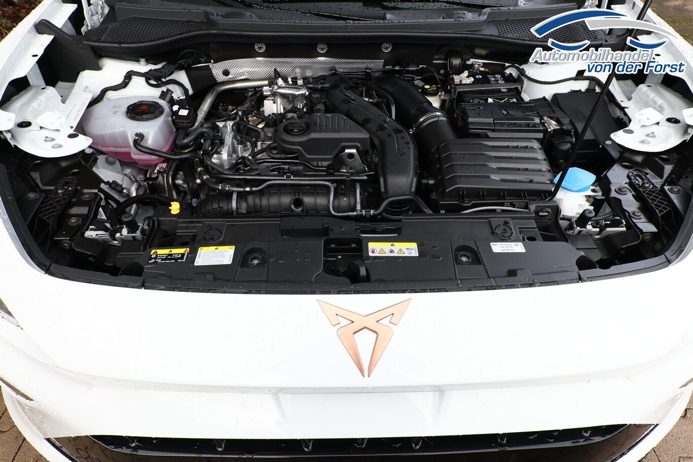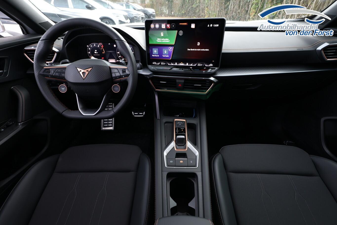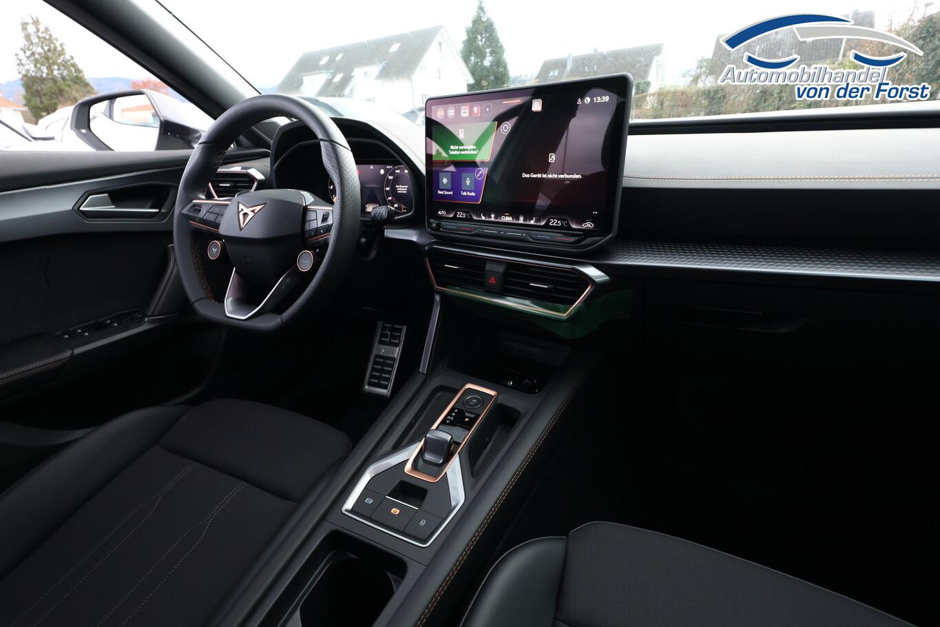 Winter-Paket (Sitzheizung vorn), Anhängerkupplung Vorbereitung, Ablagetaschen an Vordersitzlehnen, Ambiente-Beleuchtung einfarbig/monocolor, Audio-Infotainmentsystem mit Touchscreen Farbbildschirm 12,9", Fahrassistenz-System: Ausweich- und Abbiegeassistent, Induktionsladeschale für Smartphone, Knieairbag vorn, LM-Felgen 8x18, Navigation in Verbindung mit dem Smartphone (über Apple Carplay / Android Auto /...), Navigationssystem Vorbereitung, Pedale Aluminium-Design, Reifen 245/45 R18, Schadstoffarm nach Abgasnorm Euro 6e (EU6 EA), Sprachsteuerungs-System, Tagfahrlicht, Wegfahrsperre elektrisch, Licht- und Sicht-Paket (Innenspiegel mit Abblendautomatik / Einschaltautomatik für Fahrlicht / Licht- und Regensensor / Lichtassistent (Coming Home, Leaving Home)), Voll-LED-Paket (Leuchtweitenregelung automatisch / Heckleuchten Voll-LED mit dynamischem Lichtband (Infinite Light) / Nebelscheinwerfer LED mit Abbiegelicht / Scheinwerfer Voll-LED), Abdeckkappen Außenspiegel Schwarz, Dachhimmel schwarz, Einstiegsleisten vorn beleuchtet, Fensterzierleisten schwarz, Gepäck-/Laderaumboden doppelt, Karosserie: 5-türig, Kombiinstrument digital (virtual cockpit), Lendenwirbelstütze Sitz vorn links, verstellbar, Lendenwirbelstütze Sitz vorn rechts, verstellbar, Leseleuchten hinten LED, Leseleuchten vorn LED, Mild-Hybrid 110 kW (Motor 1,5 Ltr. - 110 kW eTSI), Otto-Partikelfilter (OPF), Parkbremse elektrisch mit Auto-Hold-Funktion, Radioempfang digital (DAB+), Sitz vorn links höhenverstellbar, Sitz vorn rechts höhenverstellbar, Sitzbezug / Polsterung: Stoff/Kunstleder schwarz (Sharp Textil), Sonnenblende links mit Spiegel (beleuchtet), Sonnenblende rechts mit Spiegel (beleuchtet), Steckdose 230V im Gepäckraum, Warnanlage für Sicherheitsgurt-System, Full Link (MirrorLink, Apple CarPlay und Android Auto), USB-Ladeanschlüsse (2-fach, Typ C) für 2.Sitzreihe, USB-Schnittstelle vorn (2-fach, Typ C), Antriebsart: Frontantrieb, Elektron. Differentialsperre (XDS), Getriebe 7-Gang - Doppelkupplungsgetriebe DSG, Klimaanlage Climatronic 3-Zonen, Airbag Beifahrerseite abschaltbar, Airbag Fahrer-/Beifahrerseite, Fensterheber elektrisch vorn + hinten mit Komfortschaltung, Isofix-Aufnahmen für Kindersitz an Beifahrersitz und Rücksitz (inkl. i-Size-Kindersitze), Kopf-Airbag-System, Mittelarmlehne vorn, Rücksitzlehne geteilt/klappbar mit Mittelarmlehne und Durchladeeinrichtung, Seitenairbag, Seitenairbag vorn mitte (Central Airbag), Seitenscheiben ab 2.Sitzreihe und Heckscheibe dunkel getönt (Privacy Glass), Zentralverriegelung / Startanlage Keyless Go (Start-Stop-Knopf), Fahrassistenz-System: Fahrprofilauswahl (CUPRA Drive Profile), Dachreling schwarz, hochglänzend, Wärmeschutzverglasung, Fahrassistenz-System: Autom. Distanzregelung (ACC / PCC) mit vorausschauender Geschw.-Regelung, Fahrassistenz-System: Verkehrszeichenerkennung, Notrufsystem, Lenkrad heizbar (CUPRA Supersport, Leder) mit Multifunktion und Schaltfunktion, Außenspiegel elektr. verstell-, heiz- und anklappbar mit Spiegelabsenkung und Welcome Light, Fahrassistenz-System: Fernlichtassistent, Einparkhilfe vorn und hinten, Fahrassistenz-System: Müdigkeitserkennung, Fahrassistenz-System: Spurhalteassistent, Fahrassistenz-System: Umfeldbeobachtungssystem (Front assist) mit City-Notbremsfunktion, Reifenkontroll-Anzeige, Start/Stop-Anlage