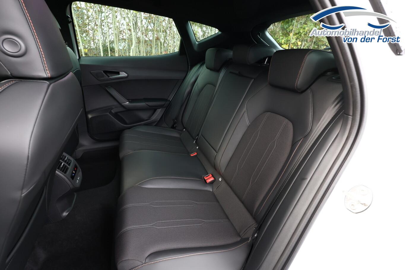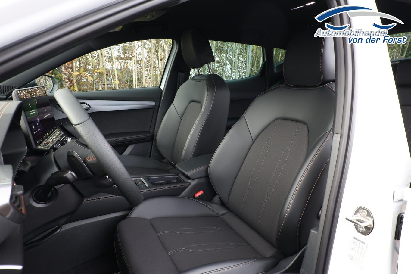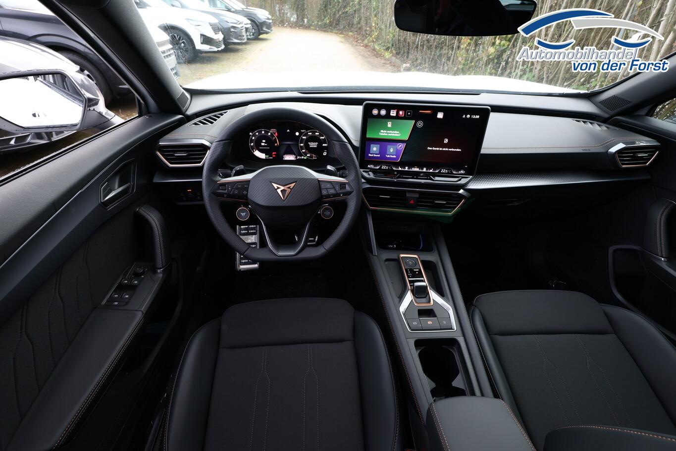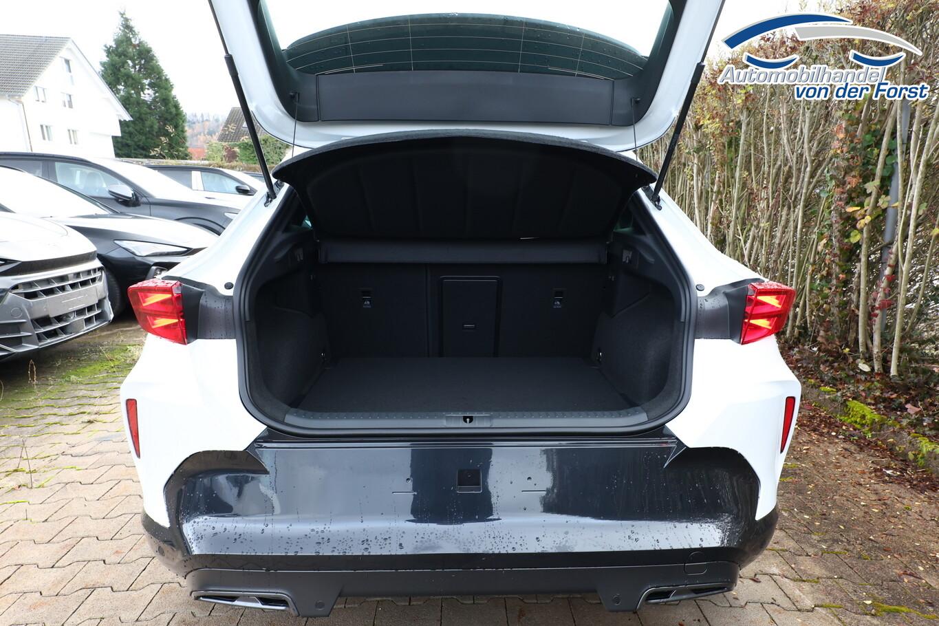 Winter-Paket (Sitzheizung vorn), Anhängerkupplung Vorbereitung, Ablagetaschen an Vordersitzlehnen, Ambiente-Beleuchtung einfarbig/monocolor, Audio-Infotainmentsystem mit Touchscreen Farbbildschirm 12,9", Fahrassistenz-System: Ausweich- und Abbiegeassistent, Induktionsladeschale für Smartphone, Knieairbag vorn, LM-Felgen 8x18, Navigation in Verbindung mit dem Smartphone (über Apple Carplay / Android Auto /...), Navigationssystem Vorbereitung, Pedale Aluminium-Design, Reifen 245/45 R18, Schadstoffarm nach Abgasnorm Euro 6e (EU6 EA), Sprachsteuerungs-System, Tagfahrlicht, Wegfahrsperre elektrisch, Licht- und Sicht-Paket (Innenspiegel mit Abblendautomatik / Einschaltautomatik für Fahrlicht / Licht- und Regensensor / Lichtassistent (Coming Home, Leaving Home)), Voll-LED-Paket (Leuchtweitenregelung automatisch / Heckleuchten Voll-LED mit dynamischem Lichtband (Infinite Light) / Nebelscheinwerfer LED mit Abbiegelicht / Scheinwerfer Voll-LED), Abdeckkappen Außenspiegel Schwarz, Dachhimmel schwarz, Einstiegsleisten vorn beleuchtet, Fensterzierleisten schwarz, Gepäck-/Laderaumboden doppelt, Karosserie: 5-türig, Kombiinstrument digital (virtual cockpit), Lendenwirbelstütze Sitz vorn links, verstellbar, Lendenwirbelstütze Sitz vorn rechts, verstellbar, Leseleuchten hinten LED, Leseleuchten vorn LED, Mild-Hybrid 110 kW (Motor 1,5 Ltr. - 110 kW eTSI), Otto-Partikelfilter (OPF), Parkbremse elektrisch mit Auto-Hold-Funktion, Radioempfang digital (DAB+), Sitz vorn links höhenverstellbar, Sitz vorn rechts höhenverstellbar, Sitzbezug / Polsterung: Stoff/Kunstleder schwarz (Sharp Textil), Sonnenblende links mit Spiegel (beleuchtet), Sonnenblende rechts mit Spiegel (beleuchtet), Steckdose 230V im Gepäckraum, Warnanlage für Sicherheitsgurt-System, Full Link (MirrorLink, Apple CarPlay und Android Auto), USB-Ladeanschlüsse (2-fach, Typ C) für 2.Sitzreihe, USB-Schnittstelle vorn (2-fach, Typ C), Antriebsart: Frontantrieb, Elektron. Differentialsperre (XDS), Getriebe 7-Gang - Doppelkupplungsgetriebe DSG, Klimaanlage Climatronic 3-Zonen, Airbag Beifahrerseite abschaltbar, Airbag Fahrer-/Beifahrerseite, Fensterheber elektrisch vorn + hinten mit Komfortschaltung, Isofix-Aufnahmen für Kindersitz an Beifahrersitz und Rücksitz (inkl. i-Size-Kindersitze), Kopf-Airbag-System, Mittelarmlehne vorn, Rücksitzlehne geteilt/klappbar mit Mittelarmlehne und Durchladeeinrichtung, Seitenairbag, Seitenairbag vorn mitte (Central Airbag), Seitenscheiben ab 2.Sitzreihe und Heckscheibe dunkel getönt (Privacy Glass), Zentralverriegelung / Startanlage Keyless Go (Start-Stop-Knopf), Fahrassistenz-System: Fahrprofilauswahl (CUPRA Drive Profile), Dachreling schwarz, hochglänzend, Wärmeschutzverglasung, Fahrassistenz-System: Autom. Distanzregelung (ACC / PCC) mit vorausschauender Geschw.-Regelung, Fahrassistenz-System: Verkehrszeichenerkennung, Notrufsystem, Lenkrad heizbar (CUPRA Supersport, Leder) mit Multifunktion und Schaltfunktion, Außenspiegel elektr. verstell-, heiz- und anklappbar mit Spiegelabsenkung und Welcome Light, Fahrassistenz-System: Fernlichtassistent, Einparkhilfe vorn und hinten, Fahrassistenz-System: Müdigkeitserkennung, Fahrassistenz-System: Spurhalteassistent, Fahrassistenz-System: Umfeldbeobachtungssystem (Front assist) mit City-Notbremsfunktion, Reifenkontroll-Anzeige, Start/Stop-Anlage