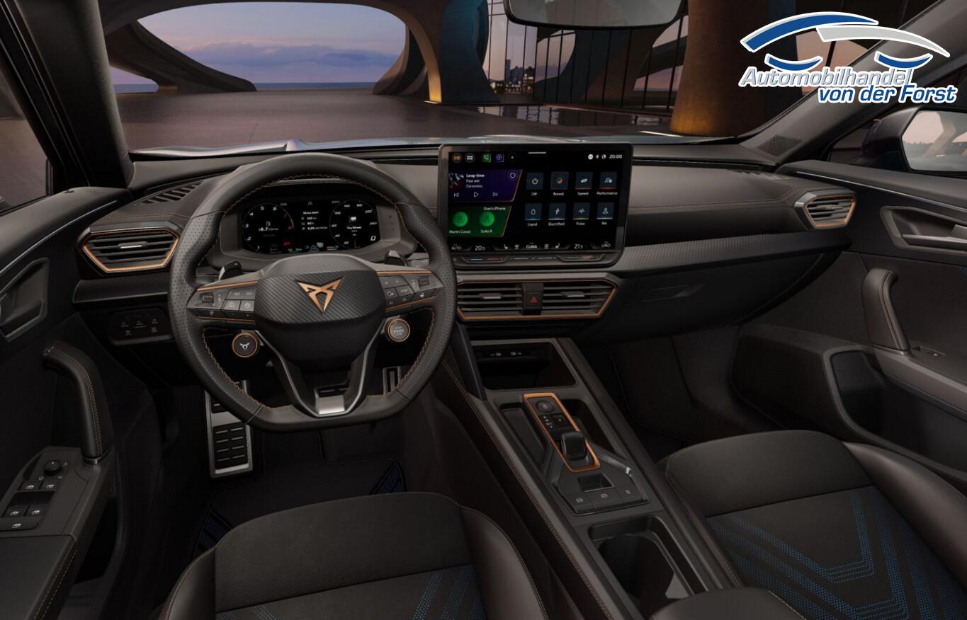 Matrix-LED-Scheinwerfer, Heckklappe/-Deckel elektr. betätigt (öffnen + schliessen, sensorgesteuert), Kamerasystem Umgebungsansicht (Top View, 360°), Winter-Paket (Sitzheizung vorn), Full Link (MirrorLink, Apple CarPlay und Android Auto), Induktionsladeschale für Smartphone, Pedale Dark Aluminium-Design, Fahrassistenz-System: Pre-Crash-System, Außenspiegel elektr. verstell- und heizbar mit Spiegelabsenkung und Welcome Light, Bluetooth Freisprecheinrichtung, Diebstahl-Warnanlage, Einparkhilfe vorn und hinten, Fahrassistenz-System: Totwinkel-Assistent mit Auspark-Assistent, Spurwechselassistent und Aussteigswarnung, Heckleuchten LED mit Ceremony Light und dynamischen Blinkern, Infotainment-System mit 12,9 Zoll Farb-Touchscreen, Intelligent Park Assist (IPA), Kofferraum mit doppeltem Ladeboden, Lenkrad heizbar mit Multifunktion, Schaltfunktion und Cupra Fahrmodusschalter, LM-Felgen 19 Zoll "Sandstorm", Reifen 245/40 R19, Schadstoffarm nach Abgasnorm Euro 6e (EU6 EA), Sitz vorn links elektr. verstellbar (mit Memory), Sitzpolster: Kunstleder/Dinamica Kombination, Stau-/Ablagefach unter Vordersitz rechts, Licht- und Sicht-Paket (Innenspiegel mit Abblendautomatik / Licht- und Regensensor / Lichtassistent (Coming Home, Leaving Home)), Audio-Navigationssystem mit Touchscreen Farbbildschirm (Sprachsteuerungs-System), Schließ-/Startsystem Kessy Advanced (Zentralverriegelung mit Fernbedienung), Fahrassistenz-System: Spurhalteassistent (Frontkamera), Ambiente-Beleuchtung Smart Ambient Light, Dachhimmel schwarz, Einstiegsleisten (Aluminium) vorn, beleuchtet, Fensterzierleisten schwarz hochglänzend, Karosserie: 5-türig, Kombiinstrument digital (virtual cockpit), Lendenwirbelstütze Sitz vorn links, verstellbar, Mittelkonsole vorn mit Mittelarmlehne, Becherhalter, Ablagebox und Luftausströmer hinten, Motor 2,0 Ltr. - 228 kW 16V TSI, Otto-Partikelfilter (OPF), Parkbremse elektrisch, Sonnenblende links mit Spiegel (beleuchtet), Sonnenblende rechts mit Spiegel (beleuchtet), USB-Ladeanschlüsse (2-fach, Typ C) für 2.Sitzreihe, USB-Schnittstelle vorn (2-fach, Typ C), Anti-Blockier-System (ABS), Antriebs-Schlupfregelung (ASR), Antriebsart: Allradantrieb, Elektron. Differentialsperre (XDS), Elektron. Stabilitätskontrolle (ESC), Fahrassistenz-System: Adaptive Fahrwerksregelung (DCC), Getriebe 7-Gang - Doppelkupplungsgetriebe DSG, Klimaanlage Climatronic 3-Zonen, Airbag Beifahrerseite abschaltbar, Airbag Fahrer-/Beifahrerseite, Seitenscheiben hinten und Heckscheibe abgedunkelt, Sport-Schalensitze vorn mit integrierten Kopfstützen, Fahrassistenz-System: Fahrprofilauswahl (CUPRA Drive Profile), Dachreling schwarz, hochglänzend, Wärmeschutzverglasung, Fahrassistenz-Paket: Stau- und Notfallassistent, Fahrassistenz-System: Automatische Distanzregelung (ACC), Servolenkung elektro-mechanisch, Blinkleuchten LED in Außenspiegel integriert, Fahrassistenz-System: Fernlichtassistent, Tagfahrlicht LED