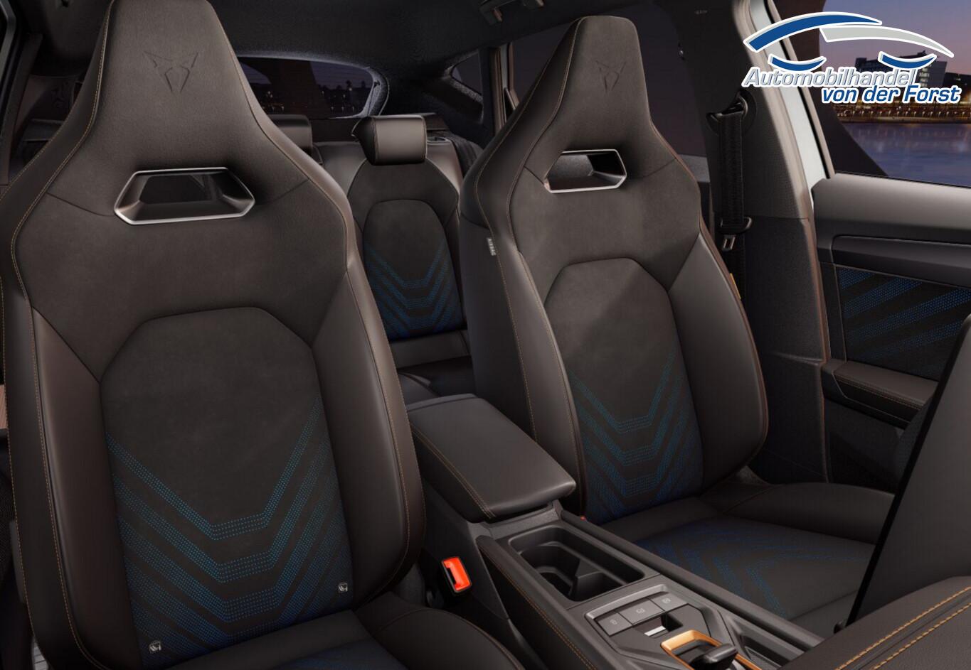 Audiosystem: Immersive by Sennheiser Sound-System (390 Watt) (11 Lautsprecher / Subwoofer), Ambiente-Beleuchtung LED, Diebstahl-Warnanlage mit Innenraumüberwachung und Abschleppschutz, Fahrassistenz-System: Abbiegebremsfunktion und Ausweichunterstützung, Fahrassistenz-System: Autom. Distanzregelung (ACC), Fahrassistenz-System: Intelligent Park Assist (IPA), Fahrassistenz-System: Pre-Crash-System, Fahrassistenz-System: Spurhalteassistent inkl. Emergency Assist und Stauassistent, Fahrassistenz-System: Totwinkel-Assistent mit Auspark-Assistent, Spurwechselassistent und Ausstiegswarnung, Geschwindigkeits-Begrenzeranlage, Heckklappe/-Deckel elektr. betätigt (öffnen + schliessen, sensorgesteuert), Induktionsladeschale für Smartphone, Isofix-Aufnahmen für Kindersitz an Beifahrersitz und Rücksitz, Kamerasystem Umgebungsansicht (Top View, 360°), Leuchtweitenregulierung automatisch, LM-Felgen 8x19 (Sandstorm), Media-System inkl. 12,9"-Touchscreen, Navigation in Verbindung mit dem Smartphone (über Apple Carplay / Android Auto /...), Nebelscheinwerfer, Reifen 245/40 R19, Schadstoffarm nach Abgasnorm Euro 6e (EU6 EB), Schließ-/Startsystem Kessy Advanced, Serviceintervall 30.000 km oder 2 Jahre, Sport-Fahrwerk, Sprachsteuerung-System, Design-Paket Dynamic (Lendenwirbelstütze Sitz vorn links, elektr. verstellbar / Sitzbezug / Polsterung: Stoff Dinamica / Kunstleder schwarz mit blauen Akzenten / Sitz vorn links elektr. verstellbar (mit Memory) / Sitzheizung vorn / Sport-Schalensitze vorn mit integrierten Kopfstützen / Außenspiegel elektr. verstell-, heiz- und anklappbar, Spiegelabsenkung, Welcome Light, Memory / Winter-Paket), Licht- und Sicht-Paket (Innenspiegel mit Abblendautomatik / Einschaltautomatik für Fahrlicht / Licht- und Regensensor / Lichtassistent (Coming Home, Leaving Home)), Dachhimmel schwarz, Einstiegsleisten vorn beleuchtet, Fensterzierleisten schwarz, Gepäck-/Laderaumboden doppelt, Karosserie: 5-türig, Kombiinstrument digital (virtual cockpit), Kopfstützen hinten (3-fach), Leseleuchten hinten LED, Leseleuchten vorn LED, Motor 2,0 Ltr. - 245 kW 16V TSI, Otto-Partikelfilter (OPF), Parkbremse elektrisch mit Auto-Hold-Funktion, Radioempfang digital (DAB+), Radstand Standard, Sitz vorn links höhenverstellbar, Sitz vorn rechts höhenverstellbar, Sonnenblende links mit Spiegel (beleuchtet), Sonnenblende rechts mit Spiegel (beleuchtet), Steckdose 230V im Gepäckraum, Warnanlage für Sicherheitsgurt-System, Full Link (MirrorLink, Apple CarPlay und Android Auto), USB-Ladeanschlüsse (2-fach, Typ C) für 2.Sitzreihe, USB-Schnittstelle vorn (2-fach, Typ C), Antriebsart: Allradantrieb, Elektron. Differentialsperre (XDS), Fahrassistenz-System: Adaptive Fahrwerksregelung (DCC), Getriebe 7-Gang - Doppelkupplungsgetriebe DSG, Klimaanlage Climatronic 3-Zonen, Airbag Beifahrerseite abschaltbar, Airbag Fahrer-/Beifahrerseite, Fensterheber elektrisch vorn + hinten mit Komfortschaltung, Kopf-Airbag-System, Mittelarmlehne vorn, Rücksitzlehne geteilt/klappbar mit Mittelarmlehne und Durchladeeinrichtung, Seitenairbag, Seitenairbag vorn mitte (Central Airbag), Seitenscheiben ab 2.Sitzreihe und Heckscheibe dunkel getönt (Privacy Glass), Dachreling schwarz, hochglänzend, Fahrassistenz-System: Verkehrszeichenerkennung, Notrufsystem, Lenkrad heizbar (CUPRA Supersport, Leder) mit Multifunktion und Schaltfunktion, Außenspiegel elektr. verstell-, heiz- und anklappbar mit Spiegelabsenkung und Welcome Light, Fahrassistenz-System: Fernlichtassistent, Einparkhilfe vorn und hinten, Fahrassistenz-System: Müdigkeitserkennung, Fahrassistenz-System: Umfeldbeobachtungssystem (Front assist) mit City-Notbremsfunktion, Reifenkontroll-Anzeige, Start/Stop-Anlage