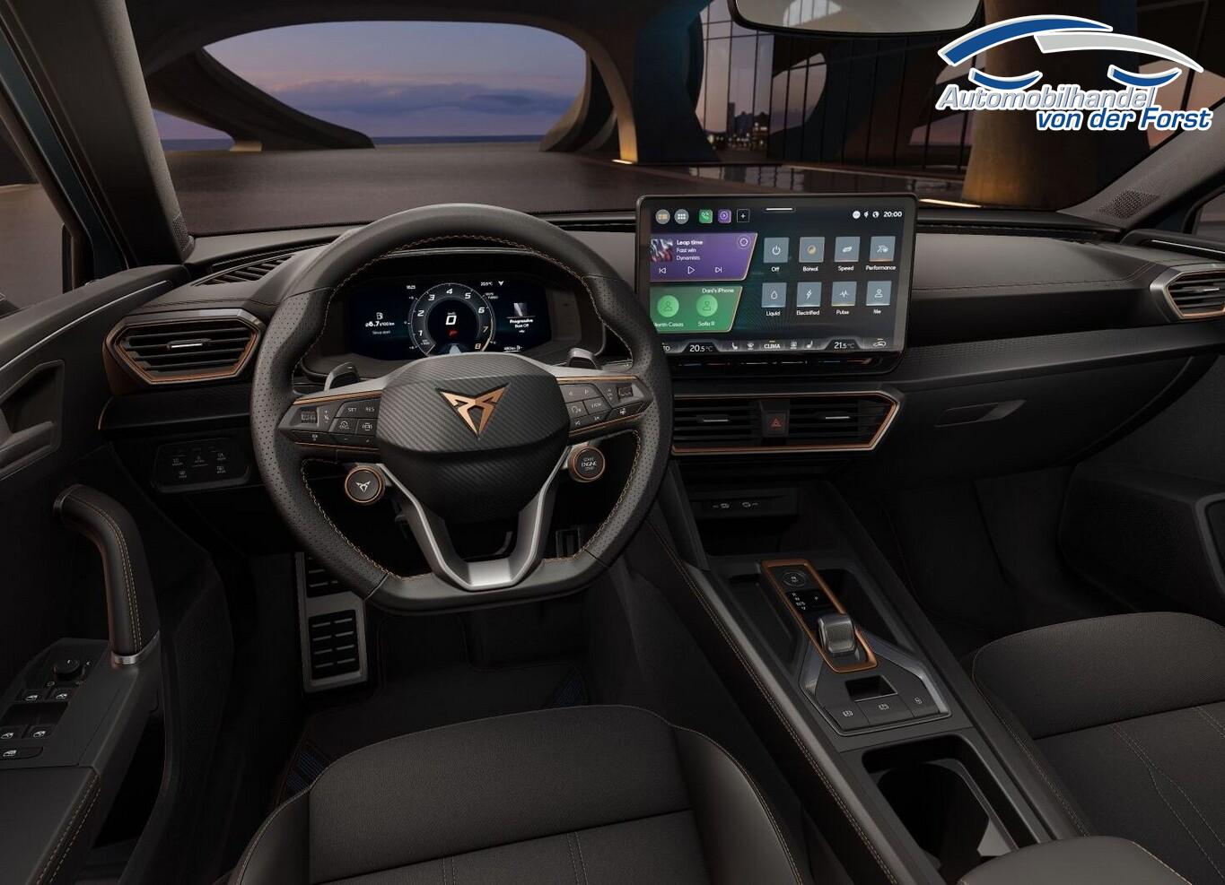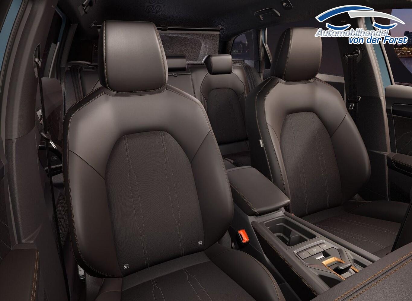 Edge Paket mit Safesicherung (Ambiente-Beleuchtung LED / Ambiente-Beleuchtung Smart Ambient Light / Schließ-/Startsystem Kessy Advanced mit Safesicherung / Heckklappe/-Deckel elektr. betätigt (öffnen + schliessen, sensorgesteuert) / Rückfahrkamera / Diebstahl-Warnanlage mit Innenraumüberwachung und Abschleppschutz), Winter-Paket (Sitzheizung vorn), Ablagetasche auf Rückseite der Vordersitzlehen, Anschlussgarantie: 1 Jahre oder 90.000 km, Außenspiegelgehäuse dark Alu, Blinkleuchten in Außenspiegel integriert, Bremsenergie-Rückgewinnung, Diebstahlsicher Radschrauben, Fahrassistenz-System: Ausweichunterstützung mit Abbiegeassistent, Gepäckraumabdeckung schiebbar, Heckscheibenwischer mit Intervallfunktion, Induktionsladeschale Wireless, Kopfstützen vorn, LM-Felgen 18 Zoll (Garbi Sport Black/Silver), Nebelschlussleuchte, Reifen 225/40 R18, Service-/Wartungsintervall 30.000 km oder 2 Jahre, Stoßfänger Sport, Vorbereitung Navigationssystem, Licht- und Sicht-Paket (Innenspiegel mit Abblendautomatik / Einschaltautomatik für Fahrlicht / Licht- und Regensensor / Lichtassistent (Coming Home, Leaving Home)), Media-System Plus (Audiosystem mit 12,9" Touchscreen-Farbdisplay), Voll-LED-Paket (Leuchtweitenregelung automatisch / Heckleuchten Voll-LED mit dynamischem Lichtband (Infinite Light) / Nebelscheinwerfer LED mit Abbiegelicht / Scheinwerfer Voll-LED), 6 Lautsprecher, Einstiegsleisten vorn beleuchtet, Fensterzierleisten schwarz hochglänzend, Gepäck-/Laderaumboden doppelt, Gepäckraum-Abtrennung (Netz), Innenausstattung: Interieurleisten Copper, Karosserie: 5-türig, Kombiinstrument digital (virtual cockpit), Kopfstützen hinten (3-fach), Lendenwirbelstütze Sitz vorn links, verstellbar, Lendenwirbelstütze Sitz vorn rechts, verstellbar, Leseleuchten hinten LED, Leseleuchten vorn LED, Mild-Hybrid 110 kW (Motor 1,5 Ltr. - 110 kW eTSI), Parkbremse elektrisch mit Auto-Hold-Funktion, Radioempfang digital (DAB+), Sitz vorn links höhenverstellbar, Sitzbezug / Polsterung: Stoff/Kunstleder schwarz (Sharp Textil), Sonnenblende links mit Spiegel (beleuchtet), Sonnenblende rechts mit Spiegel (beleuchtet), Warnanlage für Sicherheitsgurt-System, Full Link (MirrorLink, Apple CarPlay und Android Auto), USB-Ladeanschlüsse (2-fach, Typ C) für 2.Sitzreihe, USB-Schnittstelle vorn (2-fach, Typ C), Antriebsart: Frontantrieb, Differentialsperre (Vorderachse), Getriebe 7-Gang - Doppelkupplungsgetriebe DSG, Klimaanlage Climatronic 3-Zonen, Airbag Beifahrerseite abschaltbar, Airbag Fahrer-/Beifahrerseite, Fensterheber elektrisch vorn + hinten mit Komfortschaltung, Isofix-Aufnahmen für Kindersitz an Beifahrersitz und Rücksitz (inkl. i-Size-Kindersitze), Kopf-Airbag-System, Mittelarmlehne vorn, Rücksitzlehne geteilt/klappbar mit Mittelarmlehne und Durchladeeinrichtung, Seitenairbag, Seitenairbag vorn mitte (Central Airbag), Seitenscheiben ab 2.Sitzreihe und Heckscheibe dunkel getönt (Privacy Glass), Zentralverriegelung / Startanlage Keyless Go (Start-Stop-Knopf), Fahrassistenz-System: Fahrprofilauswahl (CUPRA Drive Profile), Dachreling schwarz, hochglänzend, Wärmeschutzverglasung, Fahrassistenz-System: Autom. Distanzregelung (ACC / PCC) mit vorausschauender Geschw.-Regelung, Fahrassistenz-System: Verkehrszeichenerkennung, Notrufsystem, Lenkrad heizbar (CUPRA Supersport, Leder) mit Multifunktion und Schaltfunktion, Progressivlenkung, Außenspiegel elektr. verstell-, heiz- und anklappbar mit Spiegelabsenkung und Welcome Light, Fahrassistenz-System: Fernlichtassistent, Einparkhilfe vorn und hinten, Fahrassistenz-System: Müdigkeitserkennung, Fahrassistenz-System: Spurhalteassistent, Fahrassistenz-System: Umfeldbeobachtungssystem (Front assist) mit City-Notbremsfunktion, Reifenkontroll-Anzeige