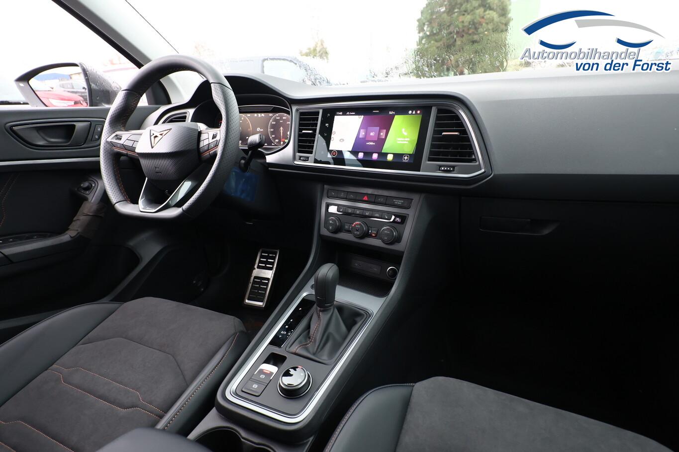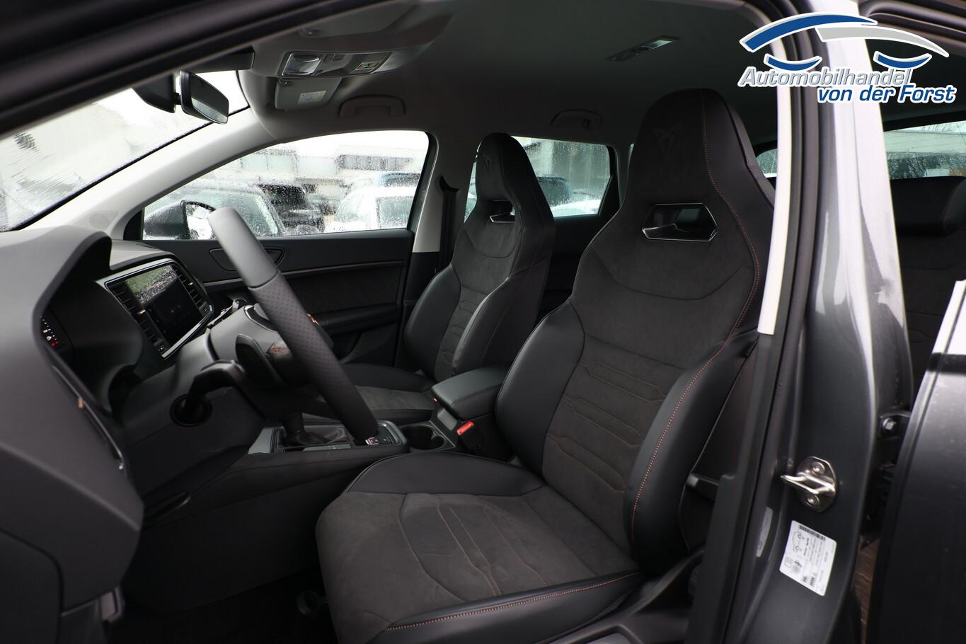 Winter-Paket (Sitzheizung vorn), Reserverad als Notrad, 8 Lautsprecher, Anschlussgarantie: 3 Jahre oder 100.000 km, Audio-Navigationssystem mit 9,2 Zoll Farb-Touchscreen, Dachspoiler, Fahrassistenz-System: Autom. Distanzregelung (ACC / PCC) mit vorausschauender Geschw. - Regelung, Fahrassistenz-System: Fernlichtassistent, Fensterzierleisten Schwarz, Gepäckraumbeleuchtung LED, Gurtwarnanlage, Handschuhfach abschließbar, Innenelemente: Dekoreinlagen Aluminium gebürstet, Lenkrad unten abgeflacht, LM-Felgen 19 Zoll (Exclusive Silver/Schwarz), Radioempfang Digital (DAB), Reifen 235/40 R19, Scheibenwaschdüsen heizbar, Sitzbezug / Polsterung: Dinamica/Kunstleder, Sprachsteuerung, Stau-/Ablagefach unter Sitz vorn rechts, Stoßfänger Sport, USB-Schnittstelle vorn (2-fach, Typ C), Licht- und Sicht-Paket (Innenspiegel mit Abblendautomatik / Licht- und Regensensor / Lichtassistent (Coming Home, Leaving Home)), Bluetooth-Schnittstelle mit Freisprecheinrichtung integriert (Bluetooth Audio-Streaming), Scheinwerfer Voll-LED (Leuchtweitenregelung automatisch), Ablagetasche an Vordersitzlehnen, Ambiente-Beleuchtung LED, Brillenfach, Einstiegsleisten (Aluminium) vorn, beleuchtet, Fußraumbeleuchtung LED, Handschuhfach mit LED-Beleuchtung, Karosserie: 5-türig, Lendenwirbelstütze Sitz vorn links, verstellbar, Lendenwirbelstütze Sitz vorn rechts, verstellbar, Mittelarmlehne hinten, Mittelkonsole vorn mit Mittelarmlehne, Becherhalter, Ablagebox und Luftausströmer hinten, Mobile Online Dienste Cupra Connect plus, Motor 1,5 Ltr. - 110 kW 16V TSI ACT, Otto-Partikelfilter (OPF), Parkbremse elektrisch, Pedale Aluminium-Design, Radstand 2681 mm, Sitz vorn links höhenverstellbar, Sitz vorn rechts höhenverstellbar, Sonnenblende links mit Spiegel (beleuchtet), Sonnenblende rechts mit Spiegel (beleuchtet), Stau-/Ablagefach unter Sitz vorn links, Steckdose (12V-Anschluß) vorn, Full Link (MirrorLink, Apple CarPlay und Android Auto), USB-Ladeanschlüsse (2-fach, Typ C) für 2.Sitzreihe, Antriebsart: Frontantrieb, Elektron. Differentialsperre (XDS), Elektron. Stabilitätskontrolle (ESC), Wegfahrsperre (elektronisch), Getriebe 7-Gang - Doppelkupplungsgetriebe DSG, Klimaanlage Climatronic 2-Zonen, Airbag Beifahrerseite abschaltbar, Airbag Fahrer-/Beifahrerseite, Fensterheber elektrisch vorn + hinten mit Komfortschaltung, Isofix-Aufnahmen für Kindersitz an Rücksitz, Knieairbag Fahrerseite, Kopf-Airbag-System, Rücksitzlehne geteilt/klappbar (1/3-2/3), Schließ-/Startsystem Kessy, Seitenairbag, Seitenscheiben hinten und Heckscheibe abgedunkelt, Sport-Schalensitze vorn mit integrierten Kopfstützen, Zentralverriegelung mit Fernbedienung, Bordcomputer, Fahrassistenz-System: Fahrprofilauswahl (CUPRA Drive Profile), Dachreling schwarz, Fahrassistenz-System: Verkehrszeichenerkennung, Notrufsystem, Lenkrad heizbar (Sport/Leder) mit Multifunktion und Schaltfunktion, Servolenkung elektro-mechanisch, Außenspiegel elektr. verstell-, heiz- und anklappbar mit Spiegelabsenkung und Welcome Light, Heckleuchten LED mit dynamischem Blinklicht, Nebelscheinwerfer LED mit Abbiegelicht, Fahrassistenz-System: Parklenkassistent mit Einparkhilfe vorn und hinten inkl. Rückfahrkamera, Fahrassistenz-System: Müdigkeitserkennung, Fahrassistenz-System: Spurhalteassistent, Fahrassistenz-System: Umfeldbeobachtungssystem (Front assist) mit City-Notbremsfunktion, Reifenkontroll-Anzeige, Start/Stop-Anlage