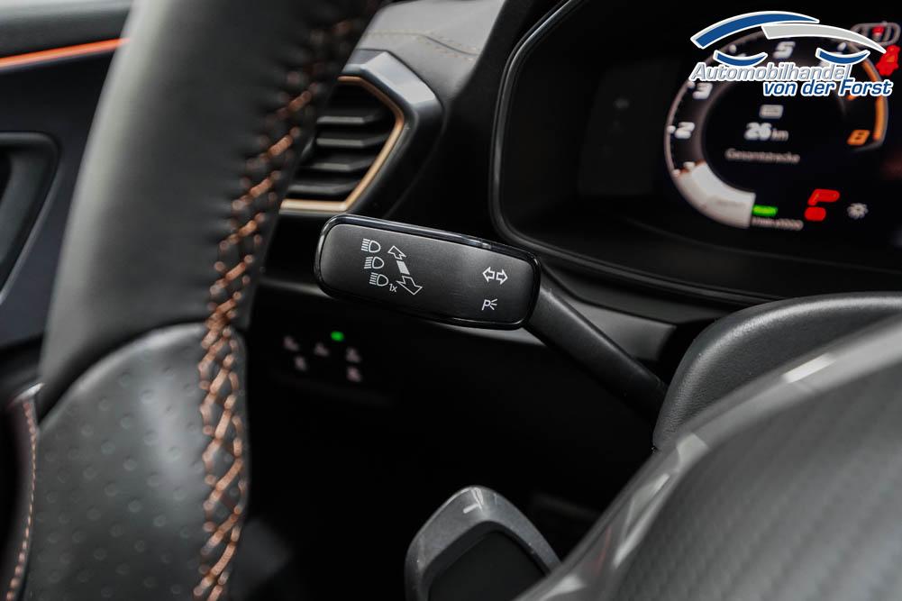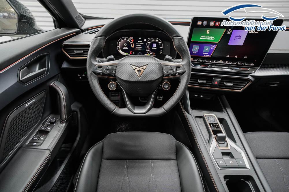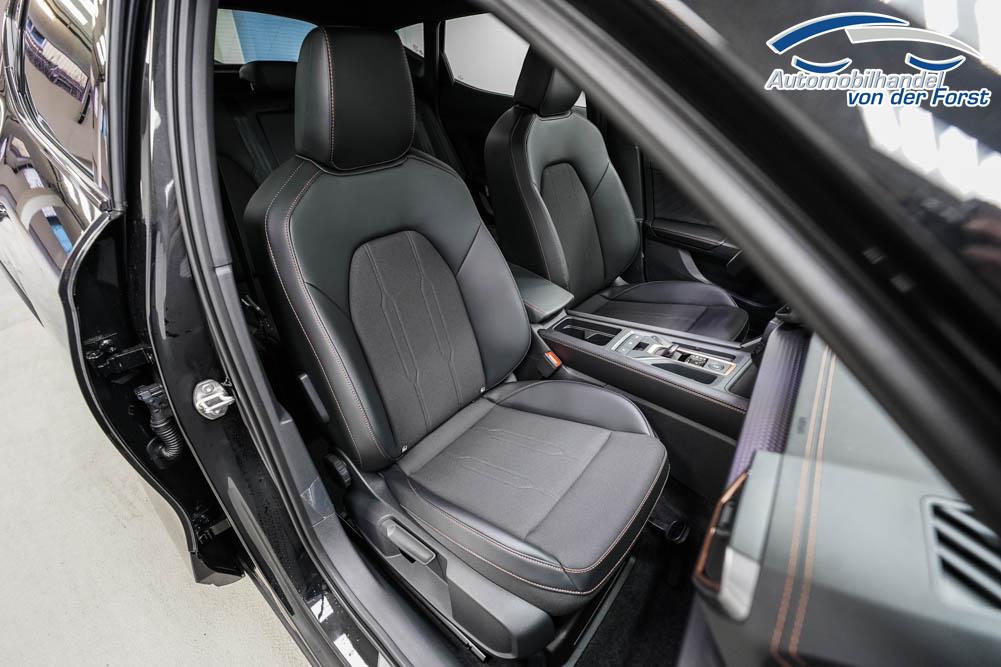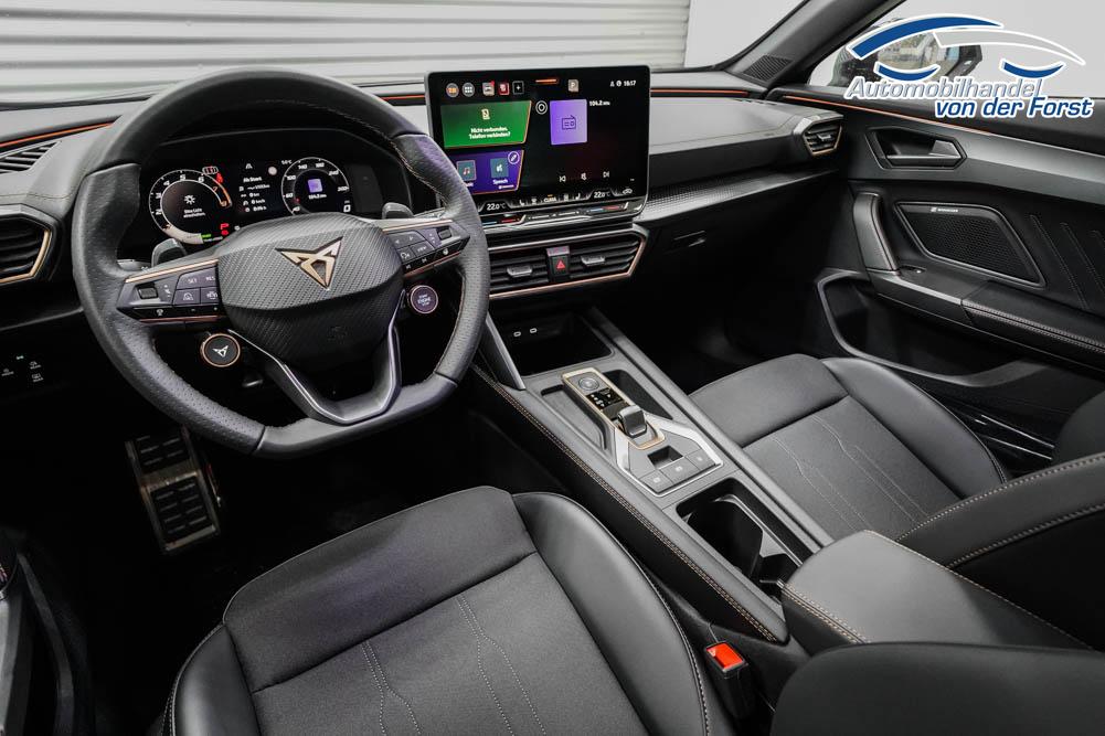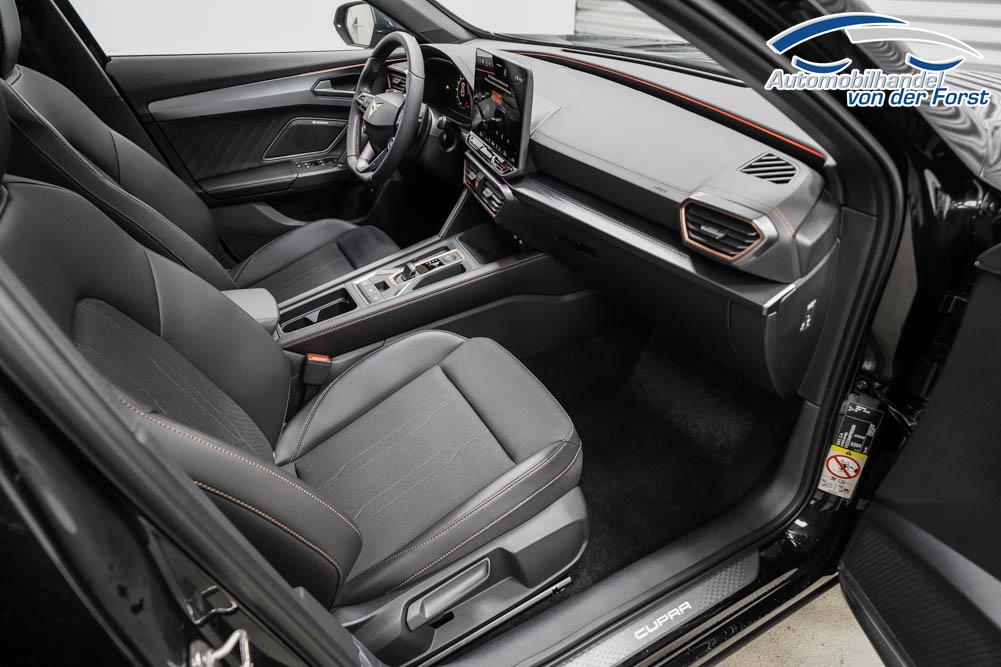 Beifahrersitz höhenverstellbar, Fahrersitz höhenverstellbar, Lederlenkrad, Lendenwirbelstütze, Mittelarmlehne vorne, Sitzbezug Stoff, geteilt umklappbare Rücksitzlehne, Lenkrad höhenverstellbar, Smart Wraparound Interieur Light, Beheizbares Lenkrad, Multifunktionslenkrad, Isofix, Isofix Beifahrersitz, abgedunkelte Scheiben, 18 Zoll Alufelgen , Dachreling schwarz, ABS, Alarmanlage, Außenspiegel elektrisch einstell-/anklappbar, Fensterheber elektrisch, Kopfairbags, Nebelscheinwerfer, Seitenairbags, Servolenkung, Sitzheizung, ESP, Wegfahrsperre, Außenspiegel beheizbar, Beifahrerairbag, Fahrerairbag, Parkpilot hinten, Parkpilot vorne, Reifendruckkontrolle, Regensensor, Lichtsensor, Digital Cockpit, Anhängekupplung schwenkbar, Tempomat Abstand ACC, Spurhalteassistent, Verkehrszeichenerkennung, LED-Scheinwerfer, Tagfahrlicht, Rückfahrkamera, Elektrische Heckklappe inkl. Virtual Pedal, KeylessEntry, StartStopSystem, Innenspiegel automatisch abbl., Müdigkeitswarnsystem, Notrufsystem, Schaltwippen, Klimaautomatik 3-Zonen, Geschwindigkeitsbegrenzer, Android Auto, Apple Carplay, Freisprecheinrichtung, Induktionsladestation, Sprachsteuerung, USB, Radio, Radio DAB, Bluetooth, Bordcomputer, IMMERSIVE by Sennheiser, Full Link, Cupra Full Link, variabler Ladeboden,