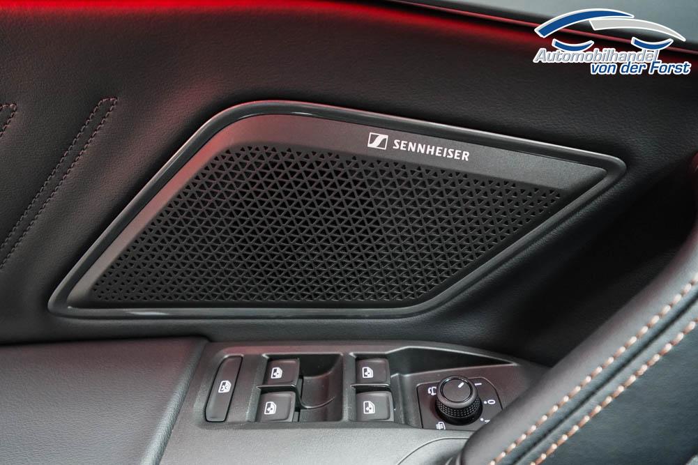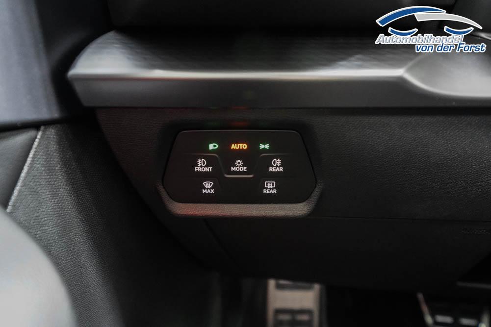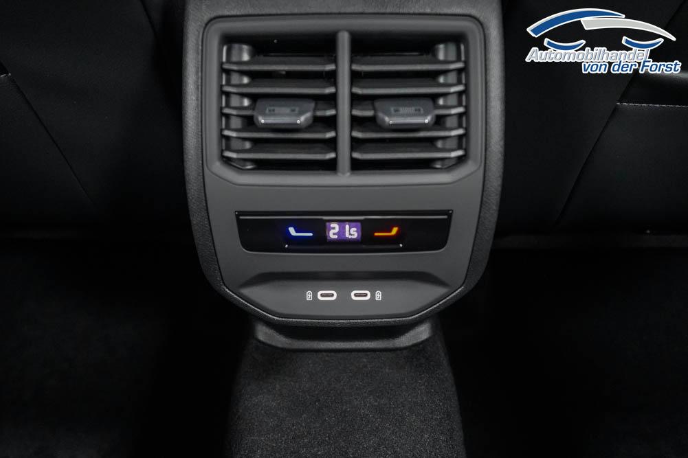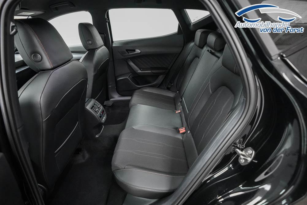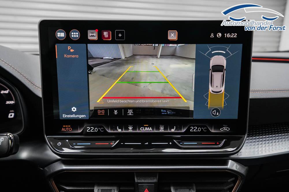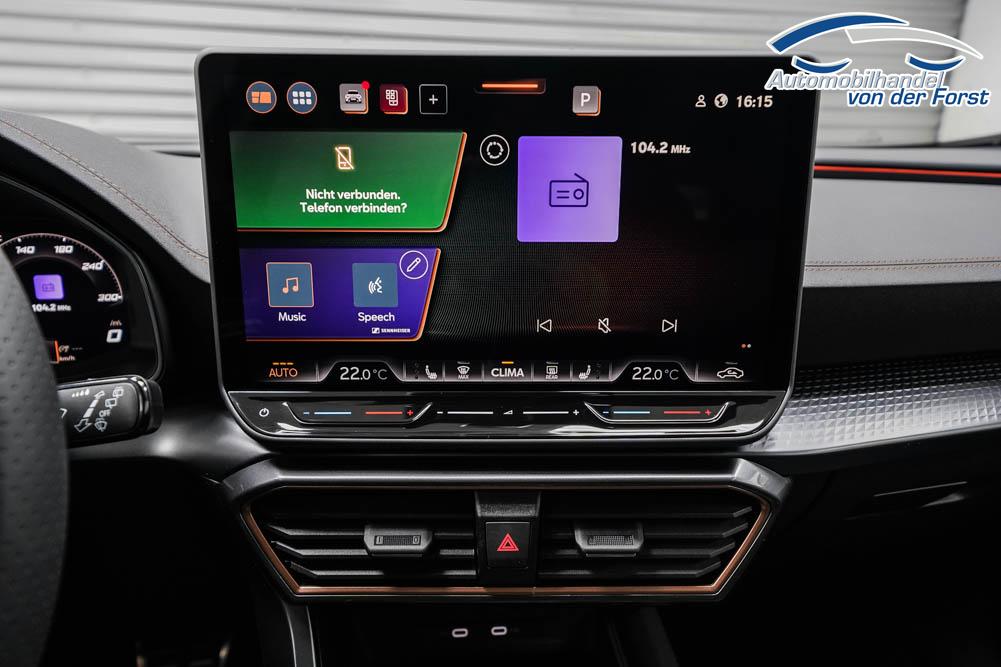 Beifahrersitz höhenverstellbar, Fahrersitz höhenverstellbar, Lederlenkrad, Lendenwirbelstütze, Mittelarmlehne vorne, Sitzbezug Stoff, geteilt umklappbare Rücksitzlehne, Lenkrad höhenverstellbar, Smart Wraparound Interieur Light, Beheizbares Lenkrad, Multifunktionslenkrad, Isofix, Isofix Beifahrersitz, abgedunkelte Scheiben, 18 Zoll Alufelgen , Dachreling schwarz, ABS, Alarmanlage, Außenspiegel elektrisch einstell-/anklappbar, Fensterheber elektrisch, Kopfairbags, Nebelscheinwerfer, Seitenairbags, Servolenkung, Sitzheizung, ESP, Wegfahrsperre, Außenspiegel beheizbar, Beifahrerairbag, Fahrerairbag, Parkpilot hinten, Parkpilot vorne, Reifendruckkontrolle, Regensensor, Lichtsensor, Digital Cockpit, Anhängekupplung schwenkbar, Tempomat Abstand ACC, Spurhalteassistent, Verkehrszeichenerkennung, LED-Scheinwerfer, Tagfahrlicht, Rückfahrkamera, Elektrische Heckklappe inkl. Virtual Pedal, KeylessEntry, StartStopSystem, Innenspiegel automatisch abbl., Müdigkeitswarnsystem, Notrufsystem, Schaltwippen, Klimaautomatik 3-Zonen, Geschwindigkeitsbegrenzer, Android Auto, Apple Carplay, Freisprecheinrichtung, Induktionsladestation, Sprachsteuerung, USB, Radio, Radio DAB, Bluetooth, Bordcomputer, IMMERSIVE by Sennheiser, Full Link, Cupra Full Link, variabler Ladeboden,