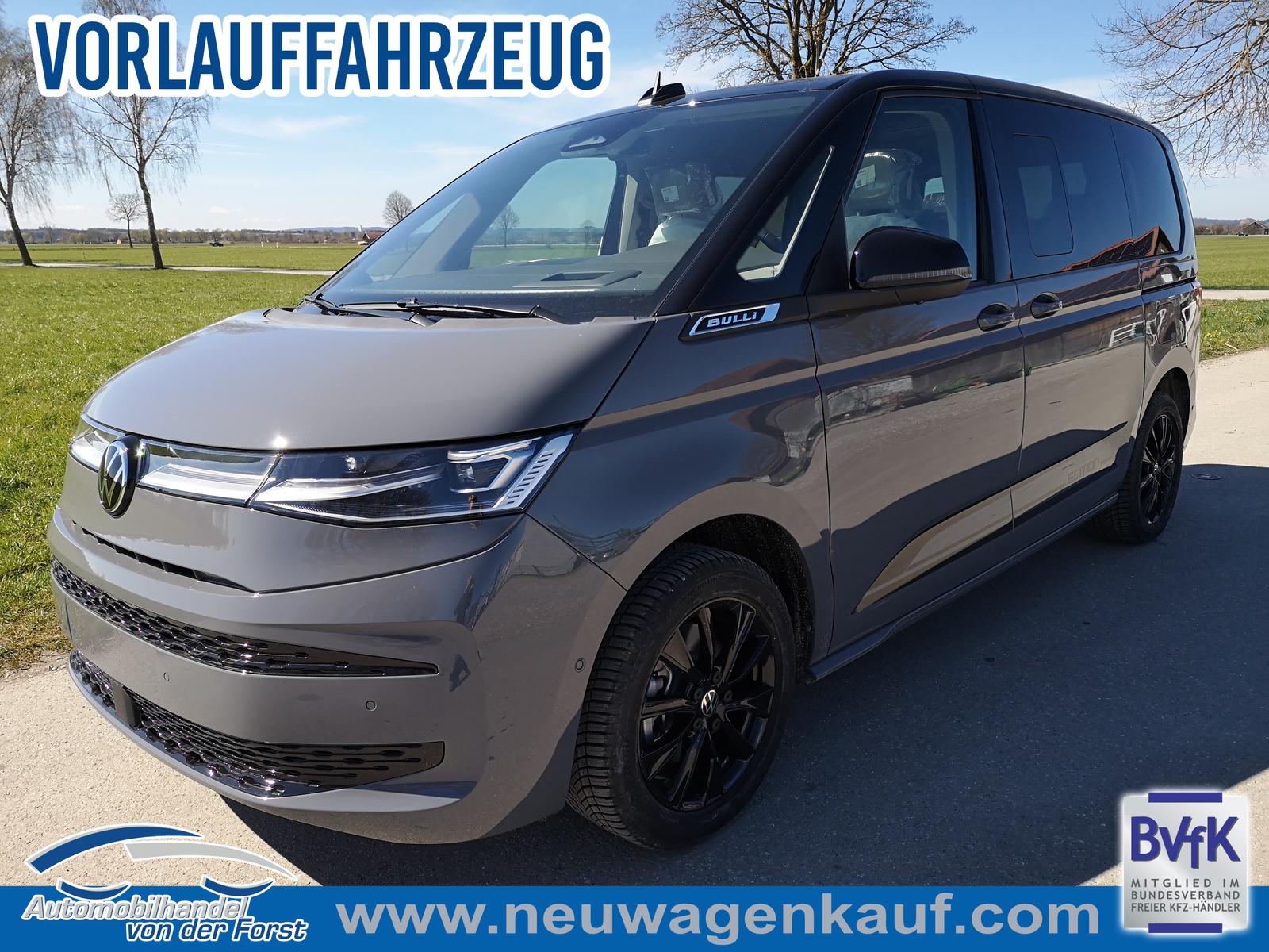Fahrzeug 8-fach-bereift, Leichtmetallräder 7,5J x 18 (Sport Edition Design TN28, schwarz glanzgedreht) mit Sommerreifen 235 50 R18, Leichtmetallräder 7,5 J x 18 ""Toshima"" schwarz mit Winterreifen (M+S Kennung inkl. Schneeflocke / Allwetterreifen), (0NP) Bulliplakette am Kotflügel, (1U3) Bodenschienen mit Multifunktionstisch inkl. 3 Becherhalter, verschiebbar auf der vollständigen Länge des Schienensystems, (2FT) Multifunktionslederlenkrad beheizbar mit Schaltwippen, (4A3) Sitzheizung vorne, (4GX) Frontscheibe beheizbar und geräuschdämmend, (4K5) Zentralverriegelung Keyless Advance (schlüsselloses Öffnen und Starten),(6I6) Travelassistent, (6KF) Scheinwerferleiste hinterleuchtet, (7AL) Diebstahlwarnanlage, (7J2) Digital Cockpit Pro, (7UY) Radio Navigationssystem Discover Pro, (9AH) Klimaanlage ""Air Care Climatronic"", (N0K) Sitzbezug Bi-Colour Leder ""Savona"", (1D2) Anhängerkupplung schwenkbar, (Z8A) Schiebefenster im Fahrgastraum links und rechts, Fenster ab B-Säule abgedunkelt, (ZBR) 7 Sitzer: Sitzvariante 2-2-3 (Vis-a-Vis entgegen der Fahrrichtung) inkl. 4 Armlehnen, (1LB) Fahrwerk 17 Zoll, (2H5) Fahrprofilauswahl, (3FG) Panoramaglasdach, (7VL) Warmwasserstandheizung im Fahrerhaus inkl. FFB, (7W7) Proaktives Insassenschutzsystem, (9IJ) Mobiltelefon-Schnittstelle ""Comfort"" inkl. induktive Ladestation, (9VV) Soundsystem ""Harman Kardon"" inkl. 13 Lautsprecher, 840 Watt Gesamtleistung und Subwoofer, (KS1) Head Up Display, (P2G) Parkpaket Advance, Parklenkassistent inkl. ""Area View"" inkl. Rückfahrkamera, (ZED) Easy Open Paket Advanced, Umfeldbeleuchtung an der Heckklappe, Ambientebeleuchtung 30-farbig, Heckklappe sowie Schiebetüren elektrisch inkl. Easy Open/Close Funktion.