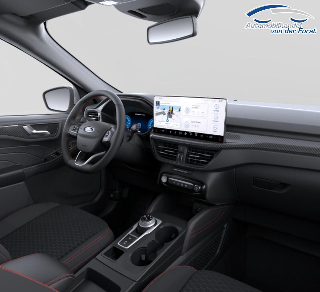 Winter-Paket (Lenkrad heizbar / Sitzheizung hinten / Frontscheibe heizbar), Verglasung hinten abgedunkelt (Privacy Glass), Reserverad als Notrad, Ladekabel mit Schukostecker, Ablagetasche an Vordersitzlehnen, Beifahrerairbag deaktivierbar, Fahrassistenz-System: Falschfahrer-Warnfunktion, Fahrassistenz-System: Müdigkeitserkennungssensor, Fahrassistenz-System: Verkehrsschildassistent, Handschuhfach beleuchtet, LM-Felgen 7,5x18, Notrufsystem, Parkbremse elektrisch, Reifen 225/60 R18, Scheinwerfer LED, Sitzbezug / Polsterung: Stoff Anthrazit mit Ziernähten in Rot, Smartphone Schnittstelle (Apple CarPlay / Android Auto), Touchscreen 13,2 Zoll, Body-Styling-Paket (Kühlergrill schwarz / Seitenschweller Wagenfarbe / Stoßfänger Sport-Ausführung), Sitz vorn links verstellbar (8-fach) (Lendenwirbelstütze Sitz vorn links), Sitz vorn rechts verstellbar (8-fach) (Lendenwirbelstütze Sitz vorn rechts), Audio-Navigationssystem Ford mit AppLink (6 Lautsprecher / Radioempfang digital (DAB) / Ford SYNC IV mit Navigation / Sprachsteuerung und Bluetooth-Schnittstelle / USB-Anschluss / Audiobedienung am Lenkrad), Fahrassistenz-System: Pre-Collision-System (Fahrassistenz-System: Active City Stop / Fahrassistenz-System: Auffahrwarnsystem), KeyFree-System (Power KeyFree-Startfunktion), Mittelkonsole mit Armlehne (Getränkehalter vorn / Mittelarmlehne vorn mit Staufach und 12V-Anschluß), Geschwindigkeits-Regelanlage (Tempomat) (Intelligenter Geschwindigkeits-Begrenzer), Intelligent Protection System (IPS) (3-Punkt-Sicherheitsgurt hinten / Warnanlage für Sicherheitsgurte hinten / Warnanlage für Sicherheitsgurte vorn / Airbag Fahrer-/Beifahrerseite / Kopf-Schulter-Airbag vorn und hinten / Seitenairbag vorn), Ambiente-Beleuchtung vorn (LED), Dachhimmel Stoff, dunkel, Hybrid 178 kW (Motor 2,5 Ltr. - 112 kW), Induktionsladeschale für mobile Endgeräte, Innenspiegel mit Abblendautomatik, Karosserie: 5-türig, Kombiinstrument Digitalanzeige 12,3 Zoll, Scheibenrahmen schwarz, Scheinwerfer mit Ausschaltverzögerung, Sonnenblende links mit Spiegel (beleuchtet), Sonnenblende rechts mit Spiegel (beleuchtet), Anti-Blockier-System (ABS), Antischlupfregelung (ASR), Antriebsart: Frontantrieb, Elektron. Stabilitäts-Programm (ESP), Sport-Fahrwerk, Getriebe Automatik - ECVT, Klimaautomatik 2-Zonen, Fensterheber elektrisch vorn + hinten mit Komfortschließung, Isofix-Aufnahmen für Kindersitz, Rücksitzlehne geteilt, Rücksitzlehne klappbar, Sitzheizung vorn, Sportsitze, Bordcomputer, Dachreling schwarz, Rückfahrkamera, Lenkrad (Sport/Leder, ST), Servolenkung elektrisch, Außenspiegel elektr. anklappbar, Außenspiegel elektr. verstell- und heizbar, Heckleuchten LED, Scheibenwischer mit Regensensor, Scheinwerfer-Assistent mit Tag-/Nachtsensor, Tagfahrlicht LED, Parkpilotsystem vorn und hinten, Fahrassistenz-System: Spurhalteassistent, Reifendruck-Kontrollsystem