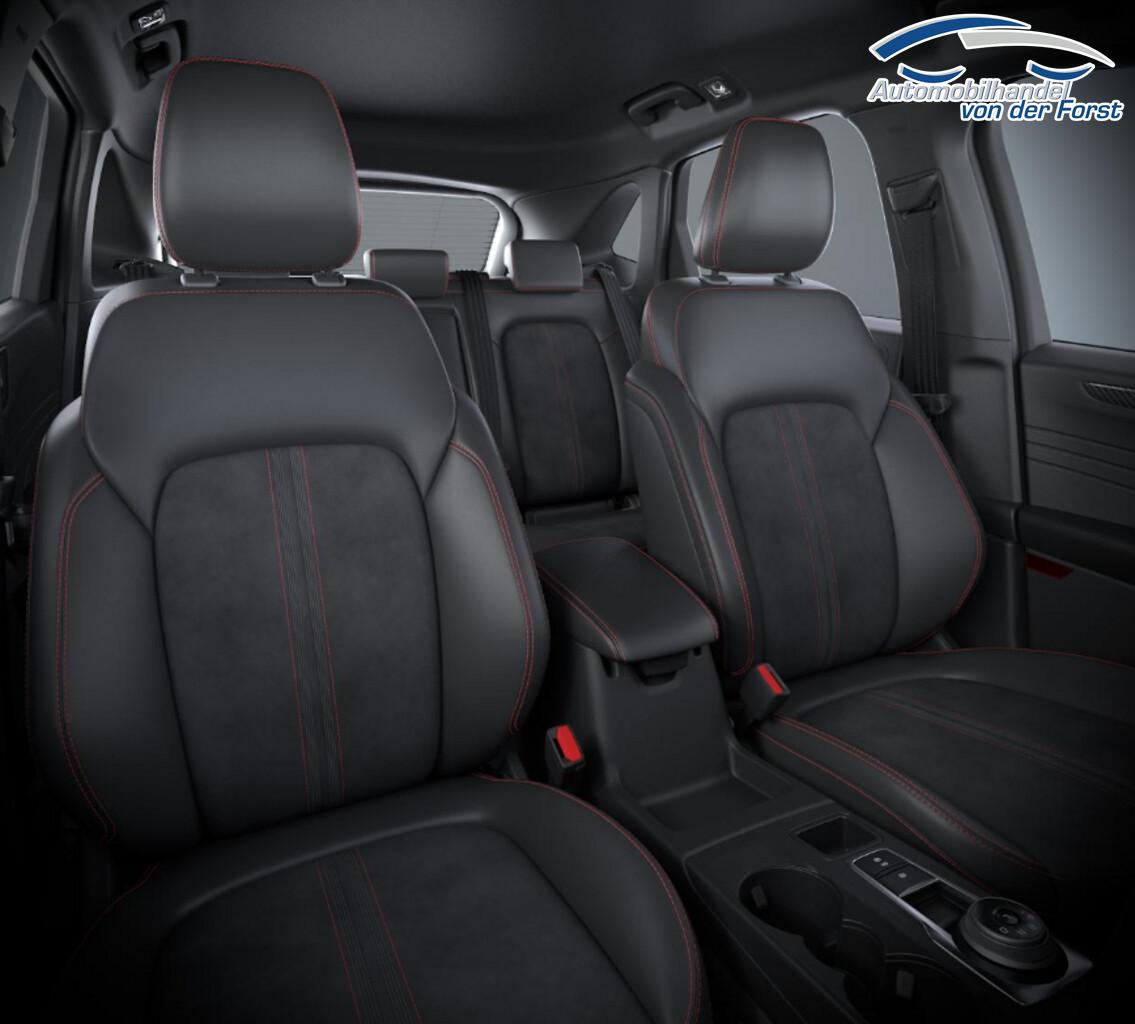 ST-Line Styling-Paket Black Package (Außenspiegel schwarz lackiert / Bremssättel Rot lackiert / Dach schwarz lackiert / Dachspoiler (große Ausführung) schwarz lackiert / Pedale Aluminium / LM-Felgen 8x20 (5x4-Speichen, Y-Design, schwarz)), Winter-Paket (Lenkrad heizbar / Sitzheizung hinten / Frontscheibe heizbar), Reserverad als Notrad, 12V-Anschluss im Kofferraum, 360° Kamerasystem, Ablagetaschen an Vordersitzlehnen, Außenspiegel mit Umfeldleuchte und Memory-Funktion, Fahrassistenz-System: Ausstiegswarnung, Fahrassistenz-System: Fernlichtassistent (Scheinwerfer mit Abblendautomatik), Fahrassistenz-System: Müdigkeitserkennungssensor, Fahrmodusschalter, Fußraumbeleuchtung, LM-Felgen 8x20 (schwarz), Notrufsystem, Parkbremse elektrisch, Reifen 245/45 R20, Rücksitze verschiebbar, Scheinwerfer LED, Sitz vorn links elektr. verstellbar (10-fach) mit Memory-Funktion, Sitz vorn rechts verstellbar (6-fach), Smartphone-Schnittstelle kabellos (Apple CarPlay / Android Auto), Sportsitze vorn, Touchscreen 13,2 Zoll, USB-Anschluss im Fond, Audio-Navigationssystem Ford mit AppLink (9 Lautsprecher / Radioempfang digital (DAB) / Sound-System Bang & Olufsen Play / Subwoofer / Ford SYNC IV mit Navigation / Sprachsteuerung und Bluetooth-Schnittstelle / USB-Anschluss / Audiobedienung am Lenkrad), Fahrassistenz-System: Pre-Collision-System (Fahrassistenz-System: Active City Stop / Fahrassistenz-System: Auffahrwarnsystem), KeyFree-System (Power KeyFree-Startfunktion), Mittelkonsole mit Armlehne (Getränkehalter vorn / Mittelarmlehne vorn mit Staufach und 12V-Anschluß), Fahrassistenz-System: Totwinkel-Assistent, Cross Traffic Alert und Notbremsfunktion (Fahrassistenz-System: Rückfahr-Assistent (Notbremsassistent)), Intelligent Protection System (IPS) (3-Punkt-Sicherheitsgurt hinten / Warnanlage für Sicherheitsgurte hinten / Warnanlage für Sicherheitsgurte vorn / Airbag Fahrer-/Beifahrerseite / Kopf-Schulter-Airbag vorn und hinten / Seitenairbag vorn), Ambiente-Beleuchtung vorn (LED), Dachhimmel Stoff, dunkel, Doppelendrohr Auspuffanlage, Hybrid 134 kW (Motor 2,5 Ltr. - 112 kW), Induktionsladeschale für mobile Endgeräte, Innenspiegel mit Abblendautomatik, Intelligenter Geschwindigkeits-Begrenzer, Karosserie: 5-türig, Kombiinstrument Digitalanzeige 12,3 Zoll, Lendenwirbelstütze Sitz vorn links, Lendenwirbelstütze Sitz vorn rechts, Mittelarmlehne hinten, Scheibenrahmen schwarz, Scheinwerfer mit Ausschaltverzögerung, Seitenscheiben vorn Akustikglas, Sonnenblende links mit Spiegel (beleuchtet), Sonnenblende rechts mit Spiegel (beleuchtet), Türkantenschutz / Schutzprofil vorn und hinten (Door Edge Protector), Anti-Blockier-System (ABS), Fahrassistenz-System: Post-Collision-System, Antischlupfregelung (ASR), Antriebsart: Allradantrieb, Elektron. Stabilitäts-Programm (ESP), Getriebe Automatik - ECVT, Klimaautomatik 2-Zonen, Fensterheber elektrisch vorn + hinten mit Komfortschließung, Isofix-Aufnahmen für Kindersitz, Rücksitzlehne geteilt, Rücksitzlehne klappbar, Sitzbezug / Polsterung: Kunstleder / Stoff Wildleder Optik, Sitzheizung vorn, Verglasung hinten abgedunkelt (Privacy Glass), Bordcomputer, Dachreling schwarz, Kofferraumdeckel / Heckklappe elektr. betätigt (Öffnung, sensorgesteuert), Adaptive Geschwindigkeits-Regelanlage mit Stop&Go-Funktion, Fahrassistenz-System: Falschfahrer-Warnfunktion, Fahrassistenz-System: Verkehrsschildassistent, Lenkrad (Sport/Leder, ST), Servolenkung elektrisch, Außenspiegel elektr. anklappbar, Außenspiegel elektr. verstell- und heizbar, Heckleuchten LED, Scheibenwischer mit Regensensor, Scheinwerfer-Assistent mit Tag-/Nachtsensor, Tagfahrlicht LED, Parkpilotsystem vorn und hinten, Fahrassistenz-System: Spurhalteassistent, Reifendruck-Kontrollsystem