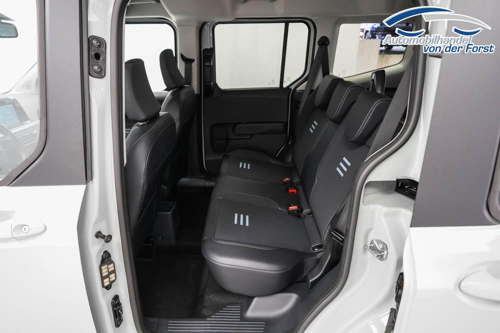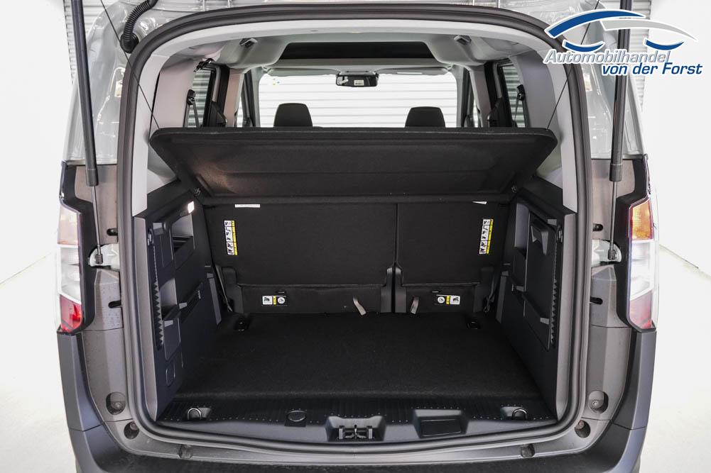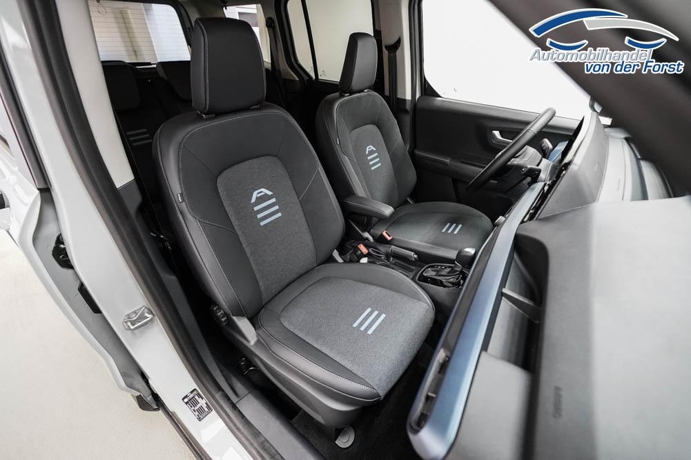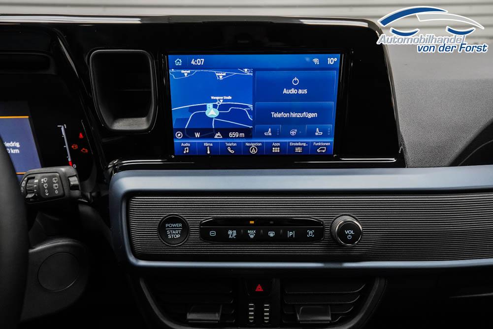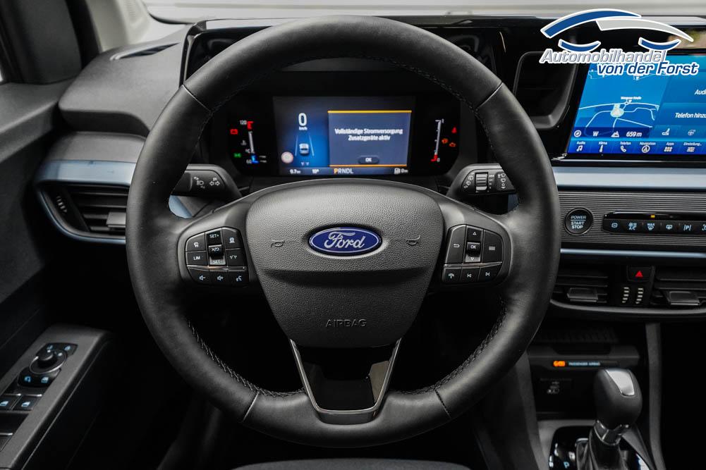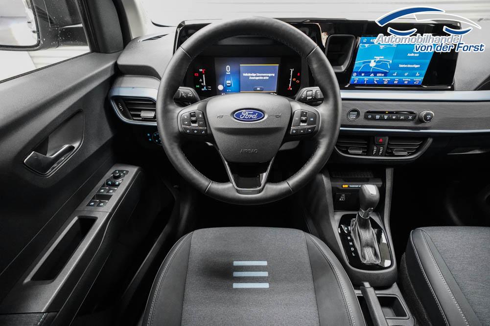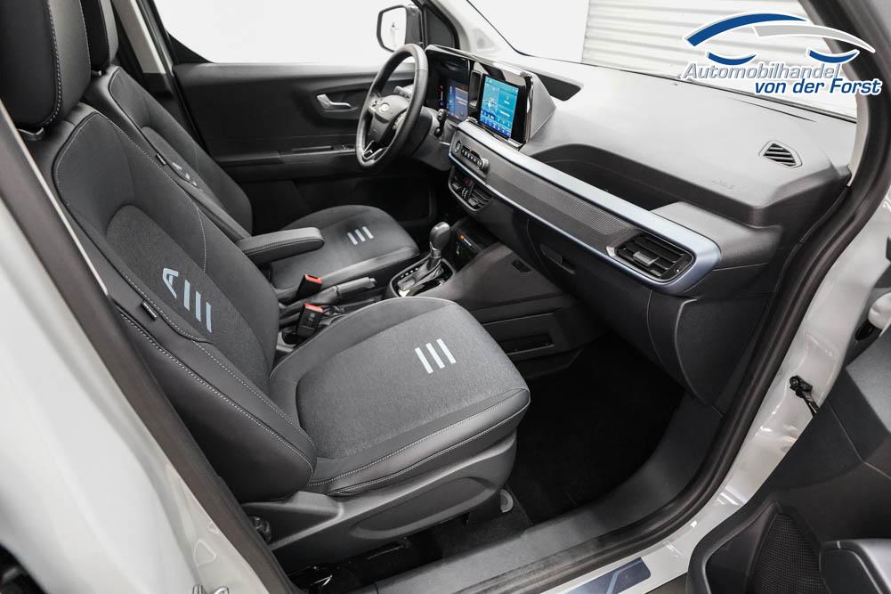 Fahrersitz höhenverstellbar, Sitzbezug Stoff, Lenkrad höhenverstellbar, Beheizbares Lenkrad, Isofix, 17 Zoll Alufelgen, Dachreling silber, Stoßfänger in Wagenfarbe, Türgriffe in Wagenfarbe, Schiebetür rechts, Schiebetür links, Schiebetür beidseitig, ABS, Außenspiegel elektrisch anklappbar, Fensterheber elektrisch, Klimaautomatik, Kopfairbags, Seitenairbags, Servolenkung, Sitzheizung vorne, ESP, Wegfahrsperre, Zentralverriegelung mit Funk, Beifahrerairbag, Fahrerairbag, Parkpilot hinten, Parkpilot vorne, Reifendruckkontrolle, Frontscheibe beheizbar, 8 Zoll digitales Kombiinstrument, adaptive Geschwindigkeitsregelung, Totwinkelassistent, Verkehrszeichenerkennung, Tagfahrlicht, Rückfahrkamera, StartStopSystem, Winterpaket, Berganfahrassistent, Müdigkeitswarnsystem, Notrufsystem, Geschwindigkeitsbegrenzer, Android Auto, Apple Carplay, Freisprecheinrichtung, Induktionsladestation, Touchscreen, USB, Radio DAB, Bluetooth, Bordcomputer, Navigationssystem, Ford Protect Erweiterte Werksgarantie 5 Jahre / 150.000 km,