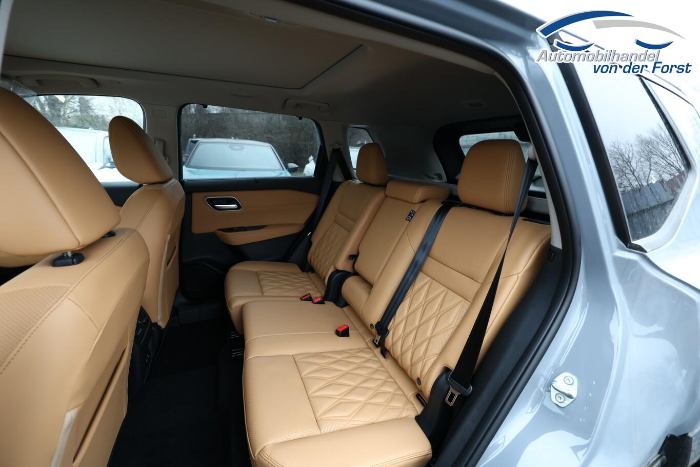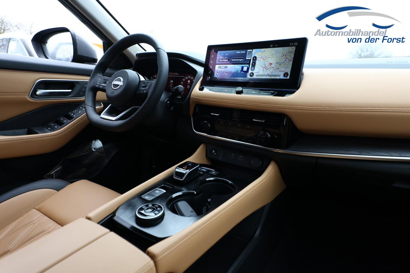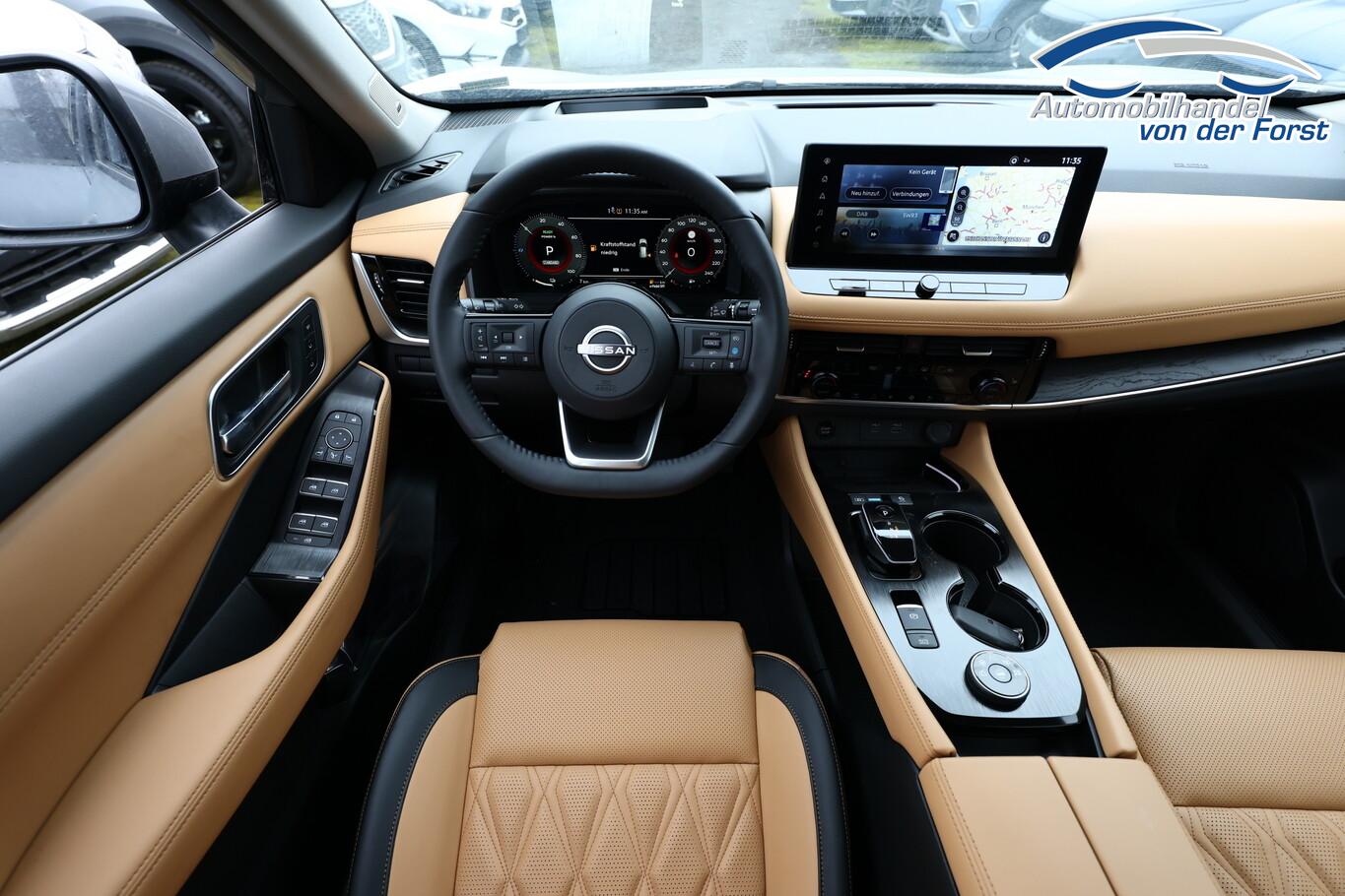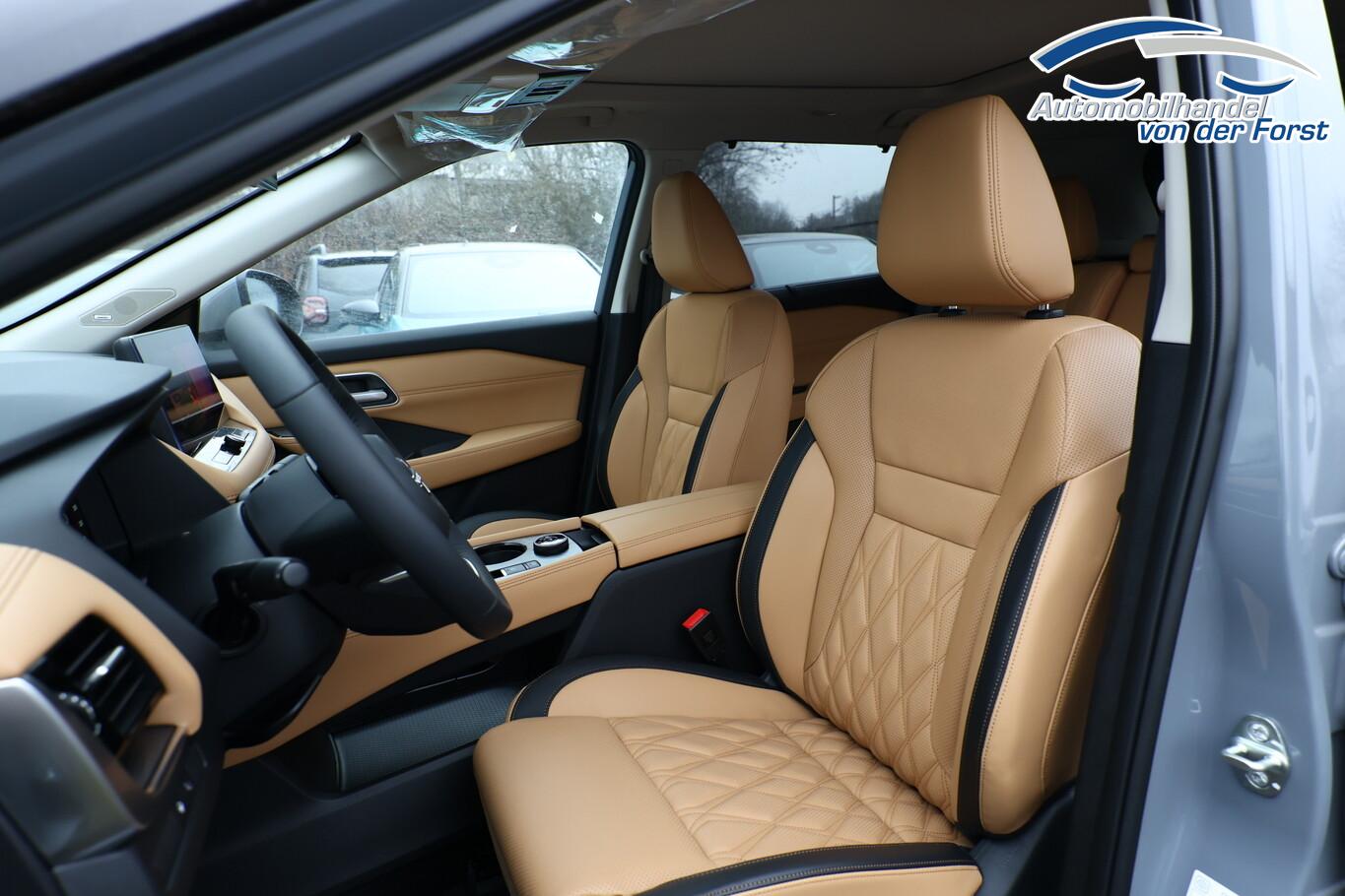 Panorama-Glasdach, Sound-System BOSE Premium (10 Lautsprecher), 2 USB-Anschlüsse vorn, Digitaler Innenspiegel mit Kamerafunktion, Einparkhilfe seitlich, Fahrassistenz-System: Kreuzungsassistent, Fahrmodi: Standard, Sport, Eco, Snow, Off-Road, Frontscheibe heizbar, Geschwindigkeits-Begrenzeranlage, Klimaautomatik 3-Zonen, Lendenwirbelstützen vorn elektr. verstellbar, Lenkrad heizbar, LM-Felgen 20", Reifen 255/45 R20, Sitz vorn links und rechts höhenverstellbar, Sitzbezug / Polsterung: Nappaleder, Sitzheizung vorn und hinten, Sonnenschutzrollo an Türscheiben hinten, Fahrassistenz-System: ProPilot mit Navi-Link (Fahrassistenz-System: Autonomer Lenk-Assistent für selbstständiges Spurhalten / Fahrassistenz-System: Autom. Distanzregelung mit vorausschauender Geschw.-Regelung / Fahrassistenz-System: Stauassistent inkl. Stop&Go-Funktion), Ausstattungs-Paket: Nissan Connect Navigationssystem (Radioempfang digital (DAB) / Touchscreen-Farbdisplay (12,3 Zoll) / Bluetooth-Schnittstelle / Freisprechanlage Bluetooth / Navigationssystem / Smartphone Schnittstelle (Apple CarPlay & Android Auto) / Sprachbediensystem Spracherkennung / Around View Monitor (360° Umgebungsansicht) / Kamerasystem Around View / Service-System: Amazon Alexa / Service-System: Google Services / Service-System: Nissan Connect Services), Scheinwerfer Voll-LED (Fahrassistenz-System: Adaptiver Fernlichtassistent), Ambiente-Beleuchtung Mittelkonsole, Ambiente-Beleuchtung Türverkleidung vorn, Elektr. Bremskraftverteilung (EBD), Elektromotor 150 kW (Hybridantrieb), Elektromotor mit Range Extender 157 kW (Motor 1,5 Ltr. - 116 kW), Fahrassistenz-System: ProPilot Park, Induktionsladeschale für Smartphone, Innenspiegel mit Abblendautomatik, Instrumentenanzeige TFT-Farbdisplay (12,3 Zoll), Karosserie: 5-türig, Otto-Partikelfilter (OPF), Parkbremse elektrisch, Radstand 2705 mm, USB-Anschluss im Fond, Anti-Blockier-System (ABS), Antriebsart: Allradantrieb, Elektron. Stabilitäts-Programm (ESP), Getriebe für Elektrofahrzeug, Airbag Fahrer-/Beifahrerseite, Isofix-Aufnahmen für Kindersitz, Keyless-Entry, Kopf-Airbag-System, Rücksitzbank verschiebbar, Rücksitzlehne geteilt (40:20:40), Schließ-/Startsystem intelligent key, Seitenairbag vorn, Seitenairbag vorn mitte (Center-Airbag), Sitz vorn links elektr. verstellbar (mit Memory), Sitz vorn rechts elektr. verstellbar (mit Memory), Verglasung hinten abgedunkelt, Fahrmodusschalter, Head-up-Display, Dachreling, Heckklappe/-Deckel elektr. betätigt (Öffnung, sensorgesteuert), Auto-Hold-Funktion, Fahrassistenz-System: Auffahrwarnsystem (Forward Collision Warning, FCW), Fahrassistenz-System: Verkehrszeichenerkennung, Rückfahrkamera, Fahrassistenz-System: Sicherheitssystem ERA GLONASS mit automatischem Notruf, Lenkrad (Leder) mit Multifunktion, Außenspiegel elektr. anklappbar, Außenspiegel elektr. verstell- und heizbar, Fahrassistenz-System: Totwinkel-Assistent, Heckleuchten LED, Licht- und Regensensor, Tagfahrlicht LED, Einparkhilfe hinten, Einparkhilfe vorn, Fahrassistenz-System: Intelligenter Parklenkassistent, Fahrassistenz-System: Autonomer Notbrems-Assistent, Fahrassistenz-System: Müdigkeitserkennungs-Sensor, Fahrassistenz-System: Querverkehrs-Assistent Heck (Rear Cross Traffic Alert, RCTA), Reifendruck-Kontrollsystem