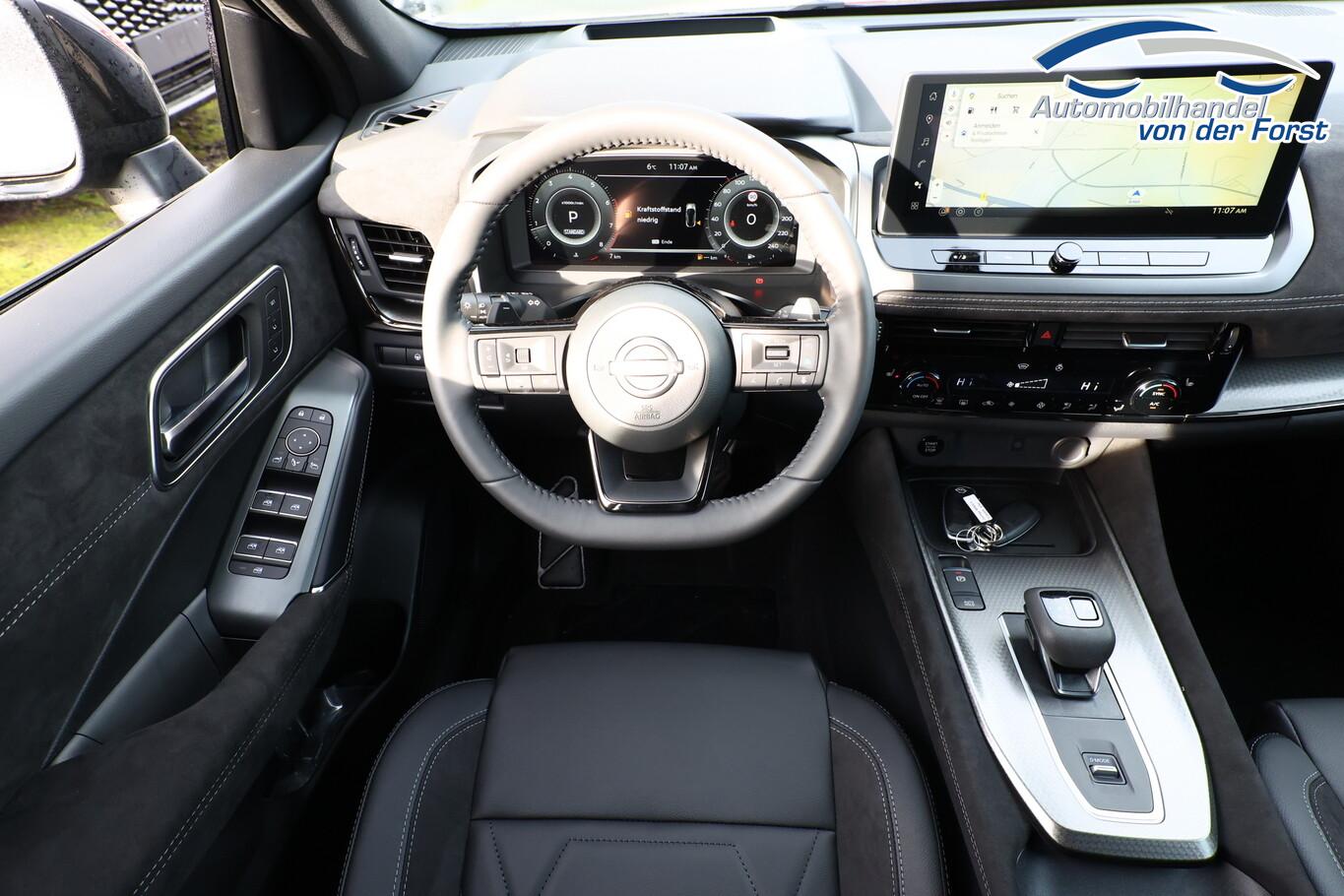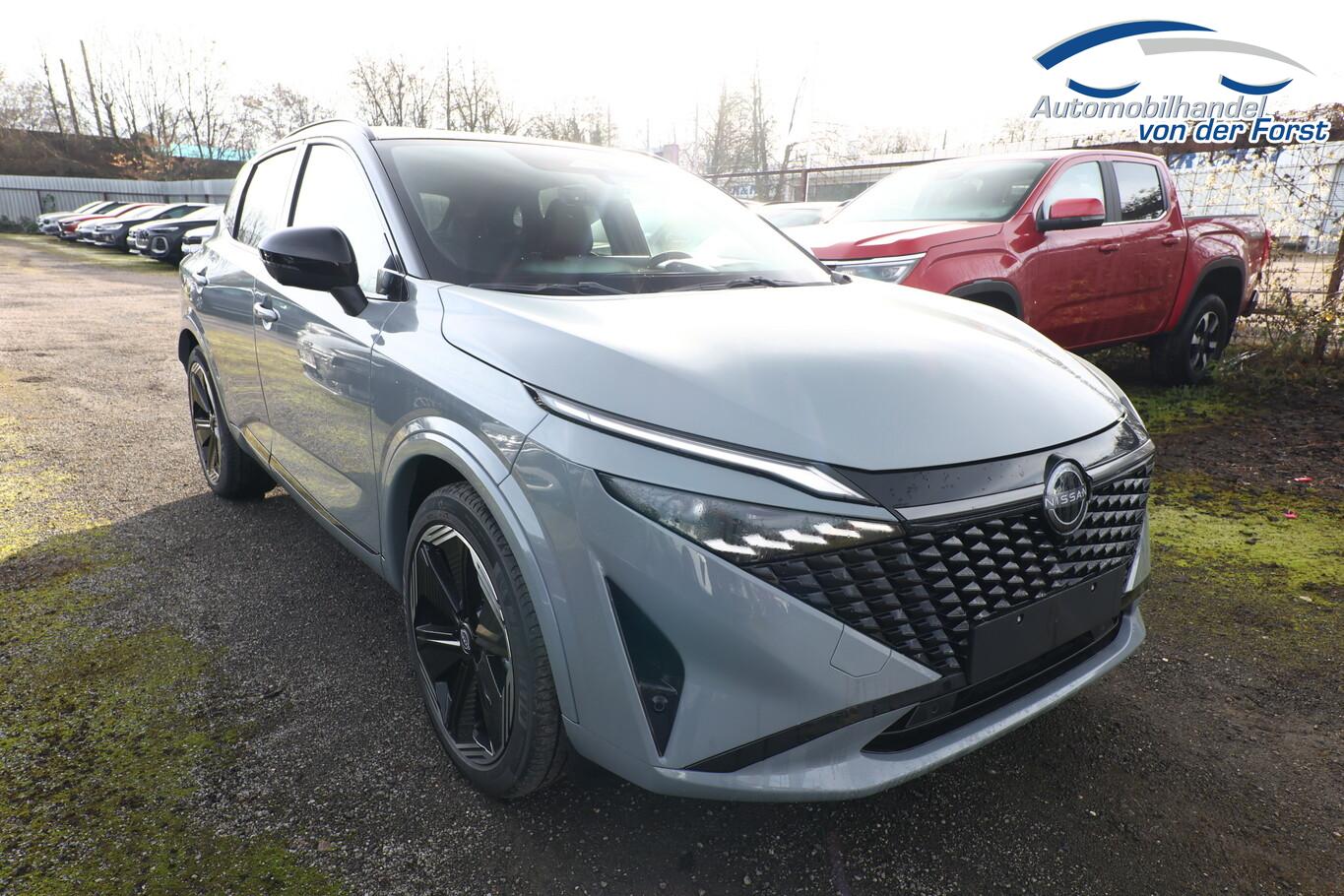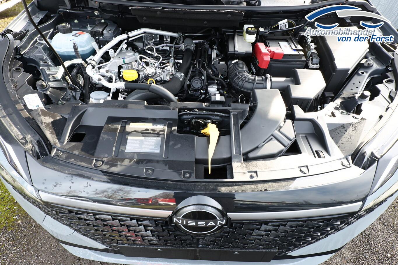 Komfort-Paket (1) (Außenspiegel elektr. verstellbar, mit Memoryfunktion rechts / Lendenwirbelstütze Sitz vorn rechts / Head-up-Display / Heckklappe/-Deckel elektr. betätigt (Öffnung, sensorgesteuert) / Außenspiegel elektr. verstellbar, mit Memoryfunktion links / Außenspiegel mit autom. Absenkfunktion), Panorama-Glasdach, Einparkhilfe vorne & hinten, Fahrassistenz-System: Spurverlassenswarnung, Induktionsladeschale für Smartphone, Innenspiegel rahmenlos mit Abblendautomatik, LM-Felgen 20 Zoll, Mehrlenker-Hinterradaufhängung, Nissan Herstellergarantie: 3 Jahre Garantie oder 100.000 km, Schadstoffarm nach Abgasnorm Euro 6e (EU6 EA), Smartphone kabellose Schnittstelle (Apple CarPlay & Android Auto), Schließ-/Startsystem intelligent key (Keyless-Entry / Start-Stop-Knopf), Lenkrad (Leder) mit Multifunktion (Audiobedienung am Lenkrad), Winter-Paket (Lenkrad heizbar / Sitzheizung vorn / Frontscheibe heizbar), 3. Bremsleuchte, Ambiente-Beleuchtung, Dachantenne im Haifischflossen-Design, Dachhimmel schwarz, Geschwindigkeits-Begrenzeranlage, Instrumentenanzeige TFT-Farbdisplay (12,3 Zoll), Karosserie: 5-türig, Lendenwirbelstütze Sitz vorn links, elektr. verstellbar, Mild-Hybrid 116 kW (Motor 1,3 Ltr. - 116 kW DIG-T MHEV), Mittelarmlehne hinten mit Getränkehalter, Notbrems-Warnblinkautomatik, Parkbremse elektrisch, Radstand 2666 mm, Schalt-/Wählhebelgriff Leder, Sitz vorn links höhenverstellbar, Sitz vorn rechts höhenverstellbar, Sonnenblenden mit Spiegel (beleuchtet), Touchscreen-Farbdisplay (12,3 Zoll), Navigationssystem, USB-Anschluss im Fond, USB-Schnittstelle, Anti-Blockier-System (ABS), Fahrassistenz-System: Moving Object Detection (MOD, Fußgängererkennung und bewegliche Objekterkennung), Antriebsart: Frontantrieb, Elektron. Stabilitäts-Programm (ESP), Getriebe Automatik stufenlos - X-Tronic-CVT, Klimaautomatik 2-Zonen, Airbag Fahrer-/Beifahrerseite, Kopf-Airbag-System, Rücksitz geteilt/klappbar, Seitenairbag, Fahrmodusschalter, Dachreling schwarz, Around View Monitor (360° Umgebungsansicht), Auto-Hold-Funktion, Fahrassistenz-System: Auffahrwarnsystem (Forward Collision Warning, FCW), Fahrassistenz-System: Berganfahr-Assistent, Fahrassistenz-System: Verkehrszeichenerkennung, Geschwindigkeits-Regelanlage (Tempomat) mit Abstandsregelung, Außenspiegel elektr. anklappbar, Außenspiegel elektr. verstell- und heizbar, Automatische Fahrlichtschaltung, Blinkleuchten LED in Außenspiegel integriert, Fahrassistenz-System: Adaptiver Fernlichtassistent, Fahrassistenz-System: Totwinkel-Assistent, Heckleuchten LED (Super rot), Scheibenwischer mit Regensensor, Scheinwerfer Voll-LED, Tagfahrlicht LED, Fahrassistenz-System: aktiver Spurhalteassistent, mit korrigierendem Bremseingriff, Fahrassistenz-System: Autonomer Notbrems-Assistent, Fahrassistenz-System: Müdigkeitserkennungs-Sensor, Diebstahl-Warnanlage