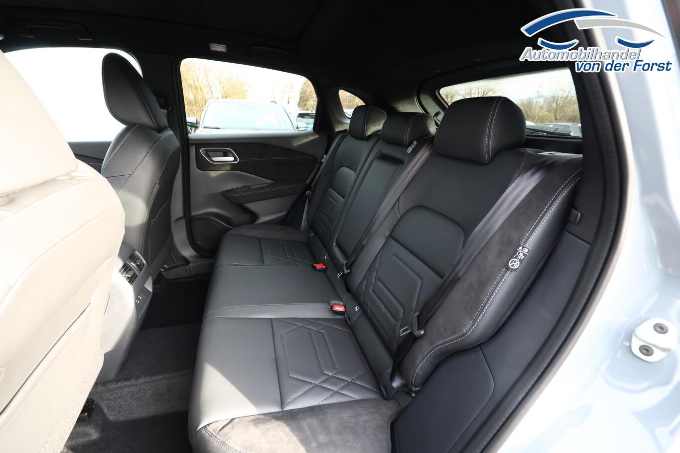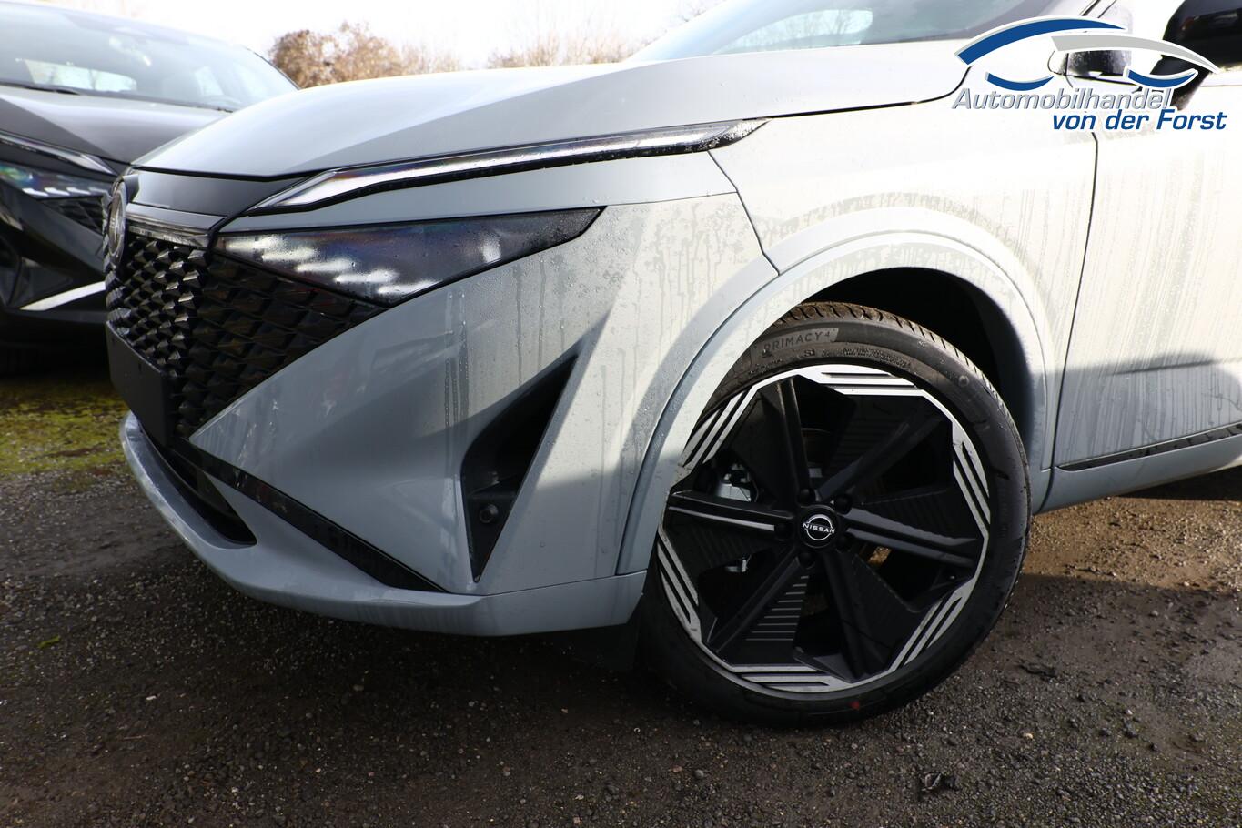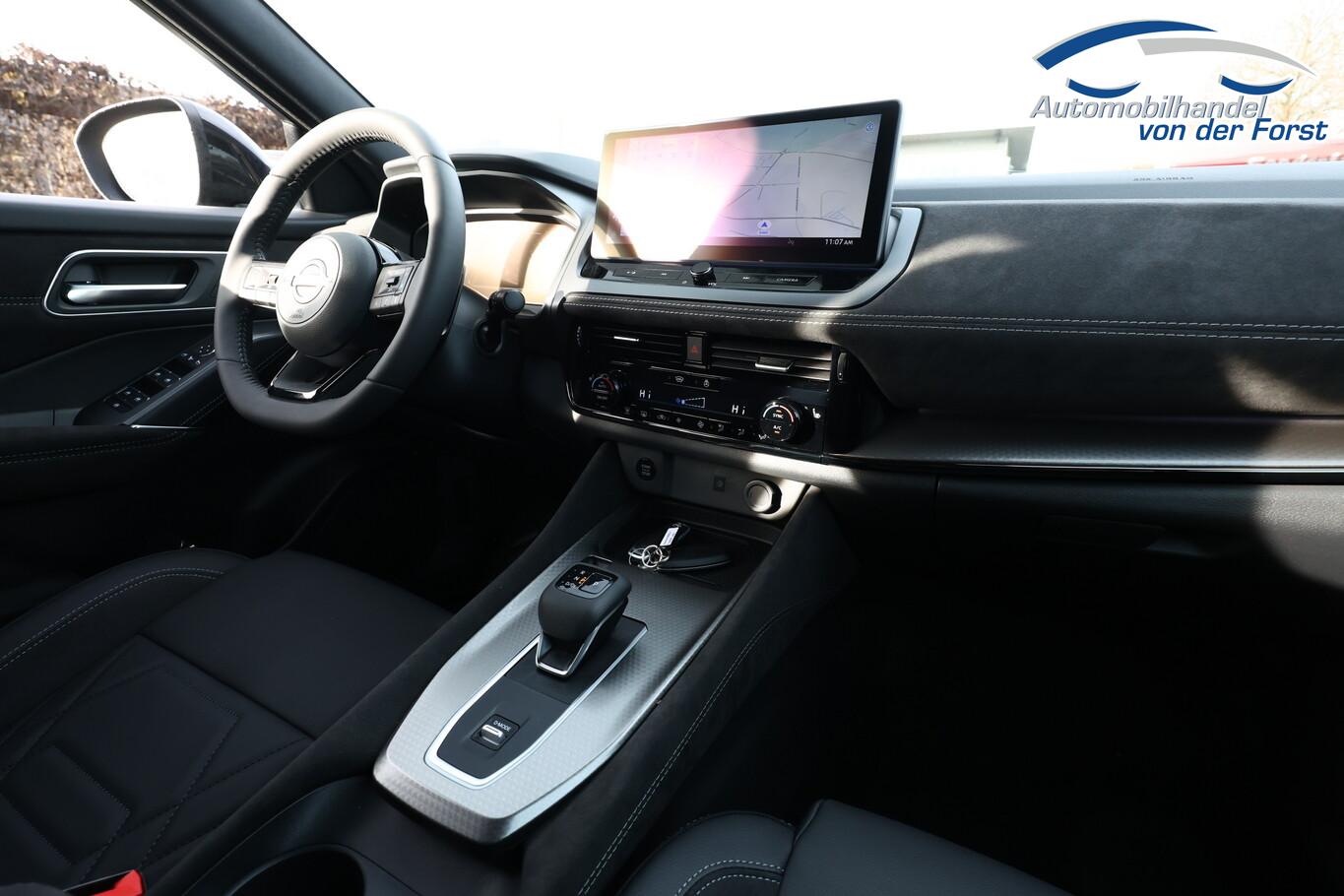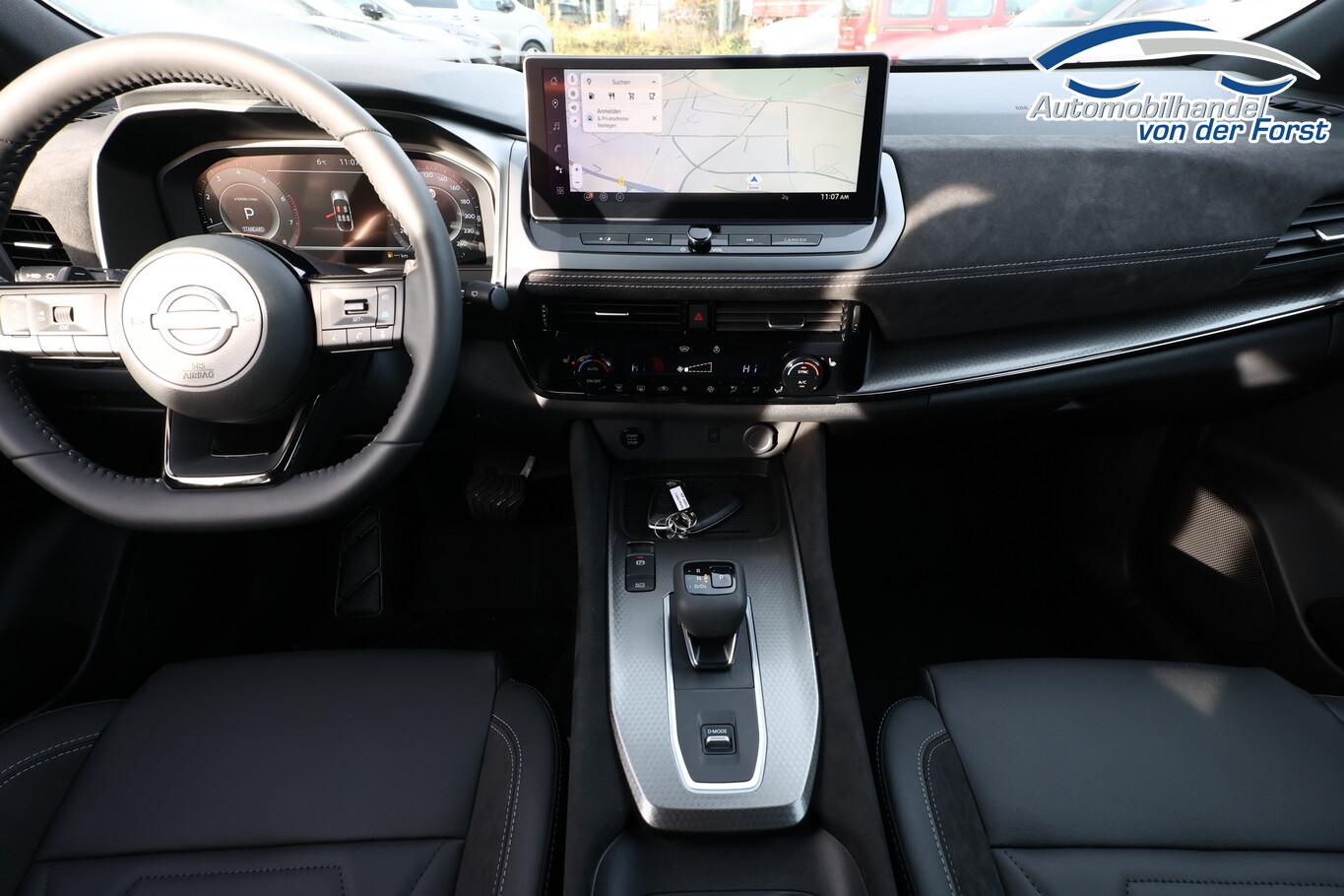 Komfort-Paket (1) (Außenspiegel elektr. verstellbar, mit Memoryfunktion rechts / Lendenwirbelstütze Sitz vorn rechts / Head-up-Display / Heckklappe/-Deckel elektr. betätigt (Öffnung, sensorgesteuert) / Außenspiegel elektr. verstellbar, mit Memoryfunktion links / Außenspiegel mit autom. Absenkfunktion), Panorama-Glasdach, Einparkhilfe vorne & hinten, Fahrassistenz-System: Spurverlassenswarnung, Induktionsladeschale für Smartphone, Innenspiegel rahmenlos mit Abblendautomatik, LM-Felgen 20 Zoll, Mehrlenker-Hinterradaufhängung, Nissan Herstellergarantie: 3 Jahre Garantie oder 100.000 km, Schadstoffarm nach Abgasnorm Euro 6e (EU6 EA), Smartphone kabellose Schnittstelle (Apple CarPlay & Android Auto), Schließ-/Startsystem intelligent key (Keyless-Entry / Start-Stop-Knopf), Lenkrad (Leder) mit Multifunktion (Audiobedienung am Lenkrad), Winter-Paket (Lenkrad heizbar / Sitzheizung vorn / Frontscheibe heizbar), 3. Bremsleuchte, Ambiente-Beleuchtung, Dachantenne im Haifischflossen-Design, Dachhimmel schwarz, Geschwindigkeits-Begrenzeranlage, Instrumentenanzeige TFT-Farbdisplay (12,3 Zoll), Karosserie: 5-türig, Lendenwirbelstütze Sitz vorn links, elektr. verstellbar, Mild-Hybrid 116 kW (Motor 1,3 Ltr. - 116 kW DIG-T MHEV), Mittelarmlehne hinten mit Getränkehalter, Notbrems-Warnblinkautomatik, Parkbremse elektrisch, Radstand 2666 mm, Schalt-/Wählhebelgriff Leder, Sitz vorn links höhenverstellbar, Sitz vorn rechts höhenverstellbar, Sonnenblenden mit Spiegel (beleuchtet), Touchscreen-Farbdisplay (12,3 Zoll), Navigationssystem, USB-Anschluss im Fond, USB-Schnittstelle, Anti-Blockier-System (ABS), Fahrassistenz-System: Moving Object Detection (MOD, Fußgängererkennung und bewegliche Objekterkennung), Antriebsart: Frontantrieb, Elektron. Stabilitäts-Programm (ESP), Getriebe Automatik stufenlos - X-Tronic-CVT, Klimaautomatik 2-Zonen, Airbag Fahrer-/Beifahrerseite, Kopf-Airbag-System, Rücksitz geteilt/klappbar, Seitenairbag, Fahrmodusschalter, Dachreling schwarz, Around View Monitor (360° Umgebungsansicht), Auto-Hold-Funktion, Fahrassistenz-System: Auffahrwarnsystem (Forward Collision Warning, FCW), Fahrassistenz-System: Berganfahr-Assistent, Fahrassistenz-System: Verkehrszeichenerkennung, Geschwindigkeits-Regelanlage (Tempomat) mit Abstandsregelung, Außenspiegel elektr. anklappbar, Außenspiegel elektr. verstell- und heizbar, Automatische Fahrlichtschaltung, Blinkleuchten LED in Außenspiegel integriert, Fahrassistenz-System: Adaptiver Fernlichtassistent, Fahrassistenz-System: Totwinkel-Assistent, Heckleuchten LED (Super rot), Scheibenwischer mit Regensensor, Scheinwerfer Voll-LED, Tagfahrlicht LED, Fahrassistenz-System: aktiver Spurhalteassistent, mit korrigierendem Bremseingriff, Fahrassistenz-System: Autonomer Notbrems-Assistent, Fahrassistenz-System: Müdigkeitserkennungs-Sensor, Diebstahl-Warnanlage