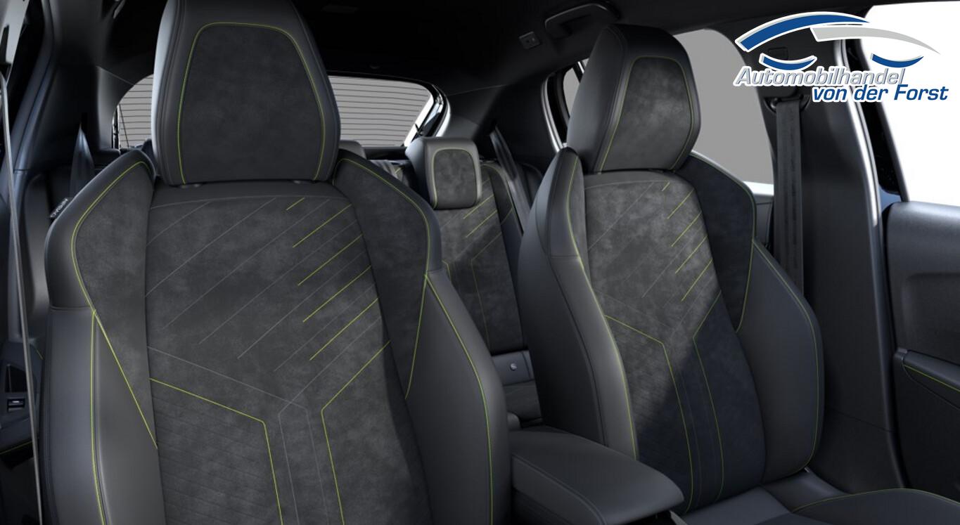 Alcantara / Kunstleder Paket (Innenausstattung: Ziernähte farbig / Sitz vorn links mit Massagefunktion / Sitzbezug / Polsterung: Alcantara / Kunstleder / Sitz vorn links elektr. verstellbar / Sitzheizung vorn), Drive-Assist-Paket Plus (Fahrassistenz-System: Aktiver Notbrems-Assistent (Active Safety Brake Plus) / Adaptive Geschwindigkeitsregelanlage (ACC) / Fahrassistenz-System: aktiver Spurpositionierungsassistent), 12V-Steckdose, 6 Lautsprecher, Bluetooth-Freisprechanlage, Fußraumbeleuchtung LED, Kombiinstrument digital, Kopfairbag vorn und hinten, Lendenwirbelstütze Sitz vorn elektr. Verstellbar, Lenkrad (Lenksäule) höhen- und tiefenverstellbar, LM-Felgen 17 Zoll "Yanaka", Multifunktionsanzeige mit HD Touchscreen-Farbdisplay 10 Zoll, Navigation in Verbindung mit dem Smartphone (über Apple Carplay / Android Auto /...), Peugeot Connect-Box inkl. Notrufsystem, Reifen 205/45 R17, Schadstoffarm nach Abgasnorm Euro 6e (EU6 EA), USB-Schnittstelle, Fensterheber elektrisch hinten, sequentiell, mit Einklemmschutz (Fensterheber elektrisch vorn / Fensterheber elektrisch vorn links), Fensterrahmen / Zierleisten schwarz glänzend (Fensterzierleisten schwarz glänzend), Radioempfang digital (DAB+) (Radioempfang digital), Sonnenblenden mit Spiegel (beleuchtet) (Sonnenblenden mit Spiegel), Außenspiegel elektr. verstell- und heizbar, beide (Außenspiegel elektr. verstell- und heizbar, links / Außenspiegel elektr. verstell- und heizbar, rechts), Scheinwerfer Full-LED (Leuchtweitenregelung), Ambiente-Beleuchtung, Außenspiegel mit Abdeckkappen schwarz, Dachhimmel schwarz, Elektr. Bremskraftverteilung, Heckscheibe heizbar, Innenspiegel mit Abblendautomatik, Karosserie: 5-türig, Kartentasche an Vordersitze, Mild-Hybrid 107 kW (Motor 1,2 Ltr. - 100 kW), Mobile Online Dienste Mirror Screen, Otto-Partikelfilter (GPF), Parkbremse elektrisch, Pedale Aluminium, Sitz vorn links höhenverstellbar, Sitz vorn rechts höhenverstellbar, Warnanlage für Sicherheitsgurte, Anti-Blockier-System (ABS), Antischlupfregelung (ASR), Elektron. Stabilitäts-Programm (ESP, Bosch), Getriebe Automatik - Doppelkupplungsgetriebe (6-Stufen, Hybrid), Klimaautomatik, Airbag Fahrer-/Beifahrerseite, Isofix-Aufnahmen für Kindersitz, Mittelarmlehne vorn, Rücksitzbank klappbar 1/3-2/3, Seitenairbag vorn, Seitenscheiben hinten und Heckscheibe dunkel getönt, Zentralverriegelung / Startanlage Keyless System, Fahrmodusschalter, Fahrassistenz-System: Berganfahrhilfe, Fahrassistenz-System: Verkehrszeichenerkennung, Rückfahrkamera mit 180° Umgebungsansicht, Lenkrad (Leder), Lenkrad mit Multifunktion, Servolenkung elektrisch, Außenspiegel elektr. anklappbar, Einschaltautomatik für Fahrlicht, Fahrassistenz-System: Fernlichtassistent, Scheibenwischer mit Regensensor, Tagfahrlicht LED, Einparkhilfe vorn und hinten, Fahrassistenz-System: aktiver Spurassistent (Lenkunterstützung), Fahrassistenz-System: Müdigkeitserkennungs-Sensor, Reifendruck-Kontrollsystem