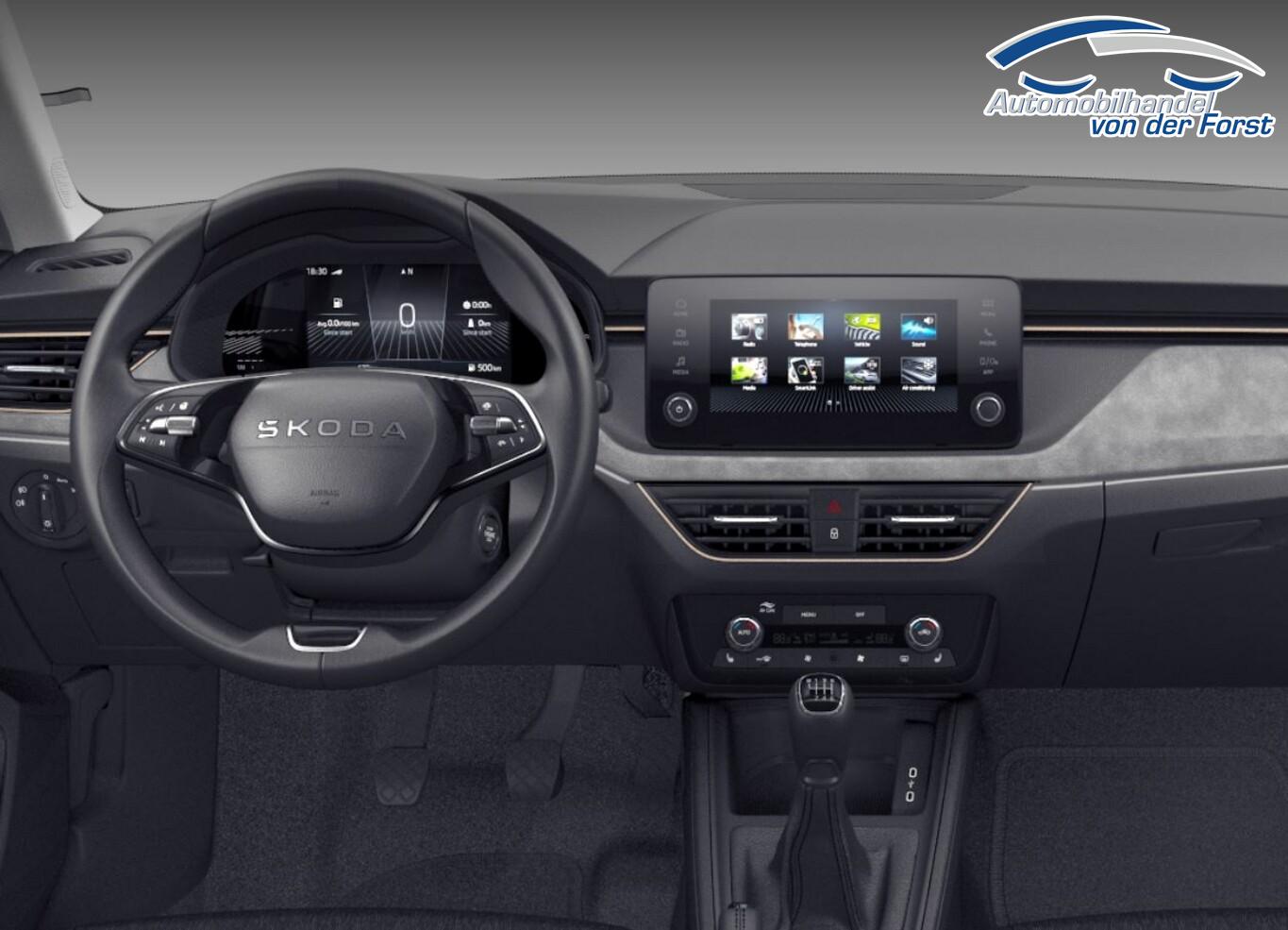 Lenkrad heizbar, Anschlussgarantie (3 Jahre / 100.000 km), Außenspiegel elektr. anklappbar mit Abblendautomatik Fahrerseite, Diebstahlsicherung Radschrauben, Heckscheibenwischer mit Intervallfunktion, Innenspiegel mit Abblendautomatik, Klimaanlage Climatronic 2-Zonen, Kopfstützen hinten, Kopfstützen vorn höhenverstellbar, LM-Felgen 16 Zoll (Cortadero), Mittelarmlehne hinten, Regensensor, Reifen 205/55 R16, Schadstoffarm nach Abgasnorm Euro 6e (EU6EA), Seitenscheiben hinten und Heckscheibe abgedunkelt (SunSet), Sicherheitsgurt-Kontrollsystem, Sitz vorn rechts höhenverstellbar, Sitzbezug / Polsterung: Stoff Lodge, Sitzheizung vorn, Stoßfänger in Wagenfarbe, Vorbereitung Skoda Connect, Wischwasser-Standanzeige, Zierleisten in Suedia Grau (Kupferzierleisten), Zentralverriegelung (Fernbedienung für Zentralverriegelung), 8 Lautsprecher, Ablagefach für Regenschirm, Ablagetasche an Vordersitzlehnen, Außenspiegel Wagenfarbe, Brillenfach, Infotainment-System mit 8,2" Display, Karosserie: 5-türig, Kombiinstrument digital (virtual cockpit), Lendenwirbelstütze Sitz vorn links, Lendenwirbelstütze Sitz vorn rechts, Motor 1,0 Ltr. - 85 kW TSI, Netzprogramm im Kofferraum, Otto-Partikelfilter (OPF), Radioempfang digital (DAB+), Schalt-/Wählhebelgriff Leder, Sitz vorn links höhenverstellbar, Steckdose (12V-Anschluß) im Koffer-/Laderaum, Türgriffe außen Wagenfarbe, Freisprechanlage Telefon mit Bluetooth, Innenspiegel mit USB-Anschluss (Typ C), USB-Schnittstelle vorn (2-fach, Typ C), Anti-Blockier-System (ABS), Bremsassistent, Elektron. Stabilitäts-Programm (ESP), Getriebe 6-Gang, Airbag Beifahrerseite abschaltbar, Airbag Fahrer-/Beifahrerseite, Fensterheber elektrisch vorn + hinten, Isofix-Aufnahmen für Kindersitz an Beifahrersitz, Isofix-Aufnahmen für Kindersitz an Rücksitz, Kopf-Airbag-System, Seitenairbag vorn, Fahrassistenz-System: Berganfahr-Assistent (Hill-Holder), Fahrassistenz-System: Verkehrszeichenerkennung, Geschwindigkeits-Regelanlage (Tempomat) inkl. Geschwindigkeits-Begrenzeranlage, Notrufsystem, Lenkrad (Leder - 2-Speichen) mit Multifunktion, Servolenkung elektronisch (Servotronic), Außenspiegel elektr. verstell- und heizbar, Heckleuchten LED mit dynamischem Blinklicht, Lichtassistent (Coming Home, Leaving Home), Nebelscheinwerfer mit Abbiegelicht, Scheinwerfer LED, Tagfahrlicht LED, Einparkhilfe hinten, Fahrassistenz-System: Müdigkeitserkennung, Fahrassistenz-System: Spurhalteassistent (Lane Assist), Start-Stop-Knopf (Start/Stop-Anlage ohne Schlüssel), Start/Stop-Anlage