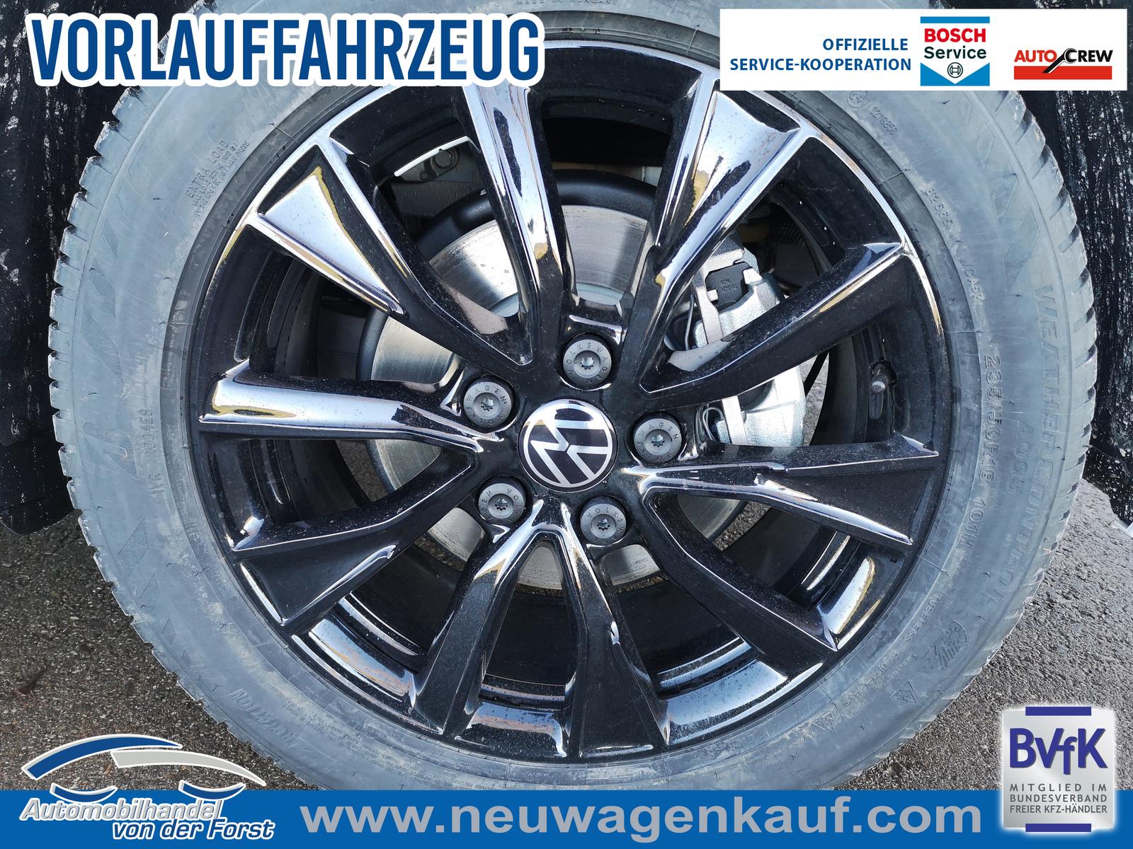 Fahrzeug 8-fach-bereift, Leichtmetallräder 7,5J x 18 (Sport Edition Design TN28, schwarz glanzgedreht) mit Sommerreifen 235 50 R18, Leichtmetallräder 7,5 J x 18 ""Toshima"" schwarz mit Winterreifen (M+S Kennung inkl. Schneeflocke / Allwetterreifen), (0NP) Bulliplakette am Kotflügel, (1U3) Bodenschienen mit Multifunktionstisch inkl. 3 Becherhalter, verschiebbar auf der vollständigen Länge des Schienensystems, (2FT) Multifunktionslederlenkrad beheizbar mit Schaltwippen, (4A3) Sitzheizung vorne, (4GX) Frontscheibe beheizbar und geräuschdämmend, (4K5) Zentralverriegelung Keyless Advance (schlüsselloses Öffnen und Starten),(6I6) Travelassistent, (6KF) Scheinwerferleiste hinterleuchtet, (7AL) Diebstahlwarnanlage, (7J2) Digital Cockpit Pro, (7UY) Radio Navigationssystem Discover Pro, (9AH) Klimaanlage ""Air Care Climatronic"", (N0K) Sitzbezug Bi-Colour Leder ""Savona"", (1D2) Anhängerkupplung schwenkbar, (Z8A) Schiebefenster im Fahrgastraum links und rechts, Fenster ab B-Säule abgedunkelt, (ZBR) 7 Sitzer: Sitzvariante 2-2-3 (Vis-a-Vis entgegen der Fahrrichtung) inkl. 4 Armlehnen, (1LB) Fahrwerk 17 Zoll, (2H5) Fahrprofilauswahl, (3FG) Panoramaglasdach, (7VL) Warmwasserstandheizung im Fahrerhaus inkl. FFB, (7W7) Proaktives Insassenschutzsystem, (9IJ) Mobiltelefon-Schnittstelle ""Comfort"" inkl. induktive Ladestation, (9VV) Soundsystem ""Harman Kardon"" inkl. 13 Lautsprecher, 840 Watt Gesamtleistung und Subwoofer, (KS1) Head Up Display, (P2G) Parkpaket Advance, Parklenkassistent inkl. ""Area View"" inkl. Rückfahrkamera, (ZED) Easy Open Paket Advanced, Umfeldbeleuchtung an der Heckklappe, Ambientebeleuchtung 30-farbig, Heckklappe sowie Schiebetüren elektrisch inkl. Easy Open/Close Funktion.