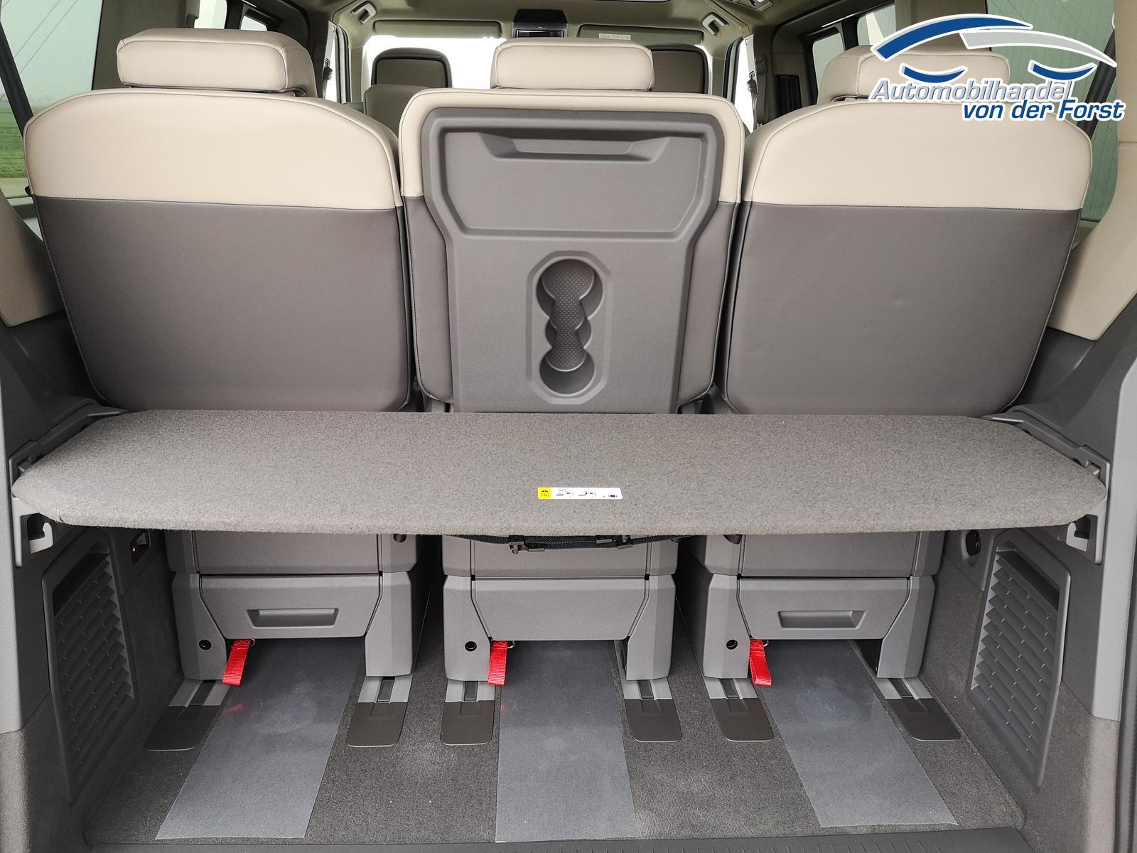 Fahrzeug 8-fach-bereift, Leichtmetallräder 7,5J x 18 (Sport Edition Design TN28, schwarz glanzgedreht) mit Sommerreifen 235 50 R18, Leichtmetallräder 7,5 J x 18 ""Toshima"" schwarz mit Winterreifen (M+S Kennung inkl. Schneeflocke / Allwetterreifen), (0NP) Bulliplakette am Kotflügel, (1U3) Bodenschienen mit Multifunktionstisch inkl. 3 Becherhalter, verschiebbar auf der vollständigen Länge des Schienensystems, (2FT) Multifunktionslederlenkrad beheizbar mit Schaltwippen, (4A3) Sitzheizung vorne, (4GX) Frontscheibe beheizbar und geräuschdämmend, (4K5) Zentralverriegelung Keyless Advance (schlüsselloses Öffnen und Starten),(6I6) Travelassistent, (6KF) Scheinwerferleiste hinterleuchtet, (7AL) Diebstahlwarnanlage, (7UY) Radio Navigationssystem Discover Pro, (9AH) Klimaanlage ""Air Care Climatronic"", (N2S) Sitzbezug Bi-Colour ""ArtVelours"", (Z2Q) Anhängerrangierassistent ""Trailer Assistent"" inkl. Anhängerkupplung schwenkbar, Parklenkassistent inkl. Rückfahrkamera, (Z8A) Schiebefenster im Fahrgastraum links und rechts, Fenster ab B-Säule abgedunkelt, (ZBR) 7 Sitzer: Sitzvariante 2-2-3 (Vis-a-Vis entgegen der Fahrrichtung) inkl. 4 Armlehnen.