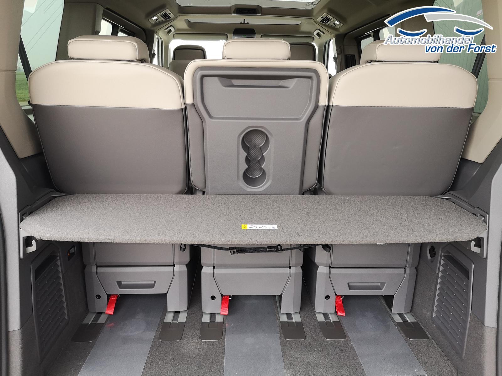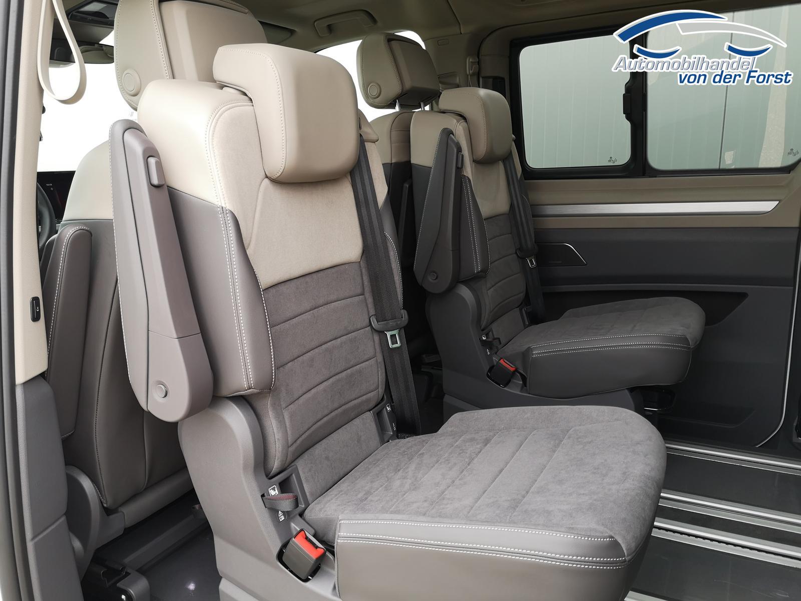 Fahrzeug 8-fach-bereift, Leichtmetallräder 7,5J x 18 (Sport Edition Design TN28, schwarz glanzgedreht) mit Sommerreifen 235 50 R18, Leichtmetallräder 7,5 J x 18 ""Toshima"" schwarz mit Winterreifen (M+S Kennung inkl. Schneeflocke / Allwetterreifen), (0NP) Bulliplakette am Kotflügel, (1U3) Bodenschienen mit Multifunktionstisch inkl. 3 Becherhalter, verschiebbar auf der vollständigen Länge des Schienensystems, (2FT) Multifunktionslederlenkrad beheizbar mit Schaltwippen, (4A3) Sitzheizung vorne, (4GX) Frontscheibe beheizbar und geräuschdämmend, (4K5) Zentralverriegelung Keyless Advance (schlüsselloses Öffnen und Starten),(6I6) Travelassistent, (6KF) Scheinwerferleiste hinterleuchtet, (7AL) Diebstahlwarnanlage, (7J2) Digital Cockpit Pro, (7UY) Radio Navigationssystem Discover Pro, (9AH) Klimaanlage ""Air Care Climatronic"", (N2S) Sitzbezug Bi-Colour ""ArtVelours"", (1D2) Anhängerkupplung schwenkbar, (Z8A) Schiebefenster im Fahrgastraum links und rechts, Fenster ab B-Säule abgedunkelt, (ZBR) 7 Sitzer: Sitzvariante 2-2-3 (Vis-a-Vis entgegen der Fahrrichtung) inkl. 4 Armlehnen, (1LB) Fahrwerk 17 Zoll, (2H5) Fahrprofilauswahl, (3FG) Panoramaglasdach, (7VL) Warmwasserstandheizung im Fahrerhaus inkl. FFB, (7W7) Proaktives Insassenschutzsystem, (9IJ) Mobiltelefon-Schnittstelle ""Comfort"" inkl. induktive Ladestation, (9VV) Soundsystem ""Harman Kardon"" inkl. 13 Lautsprecher, 840 Watt Gesamtleistung und Subwoofer, (KS1) Head Up Display, (P2G) Parkpaket Advance, Parklenkassistent inkl. ""Area View"" inkl. Rückfahrkamera, (ZED) Easy Open Paket Advanced, Umfeldbeleuchtung an der Heckklappe, Ambientebeleuchtung 30-farbig, Heckklappe sowie Schiebetüren elektrisch inkl. Easy Open/Close Funktion, ABT Leistungssteigerung auf 132kW/180PS und 400Nm Drehmoment.