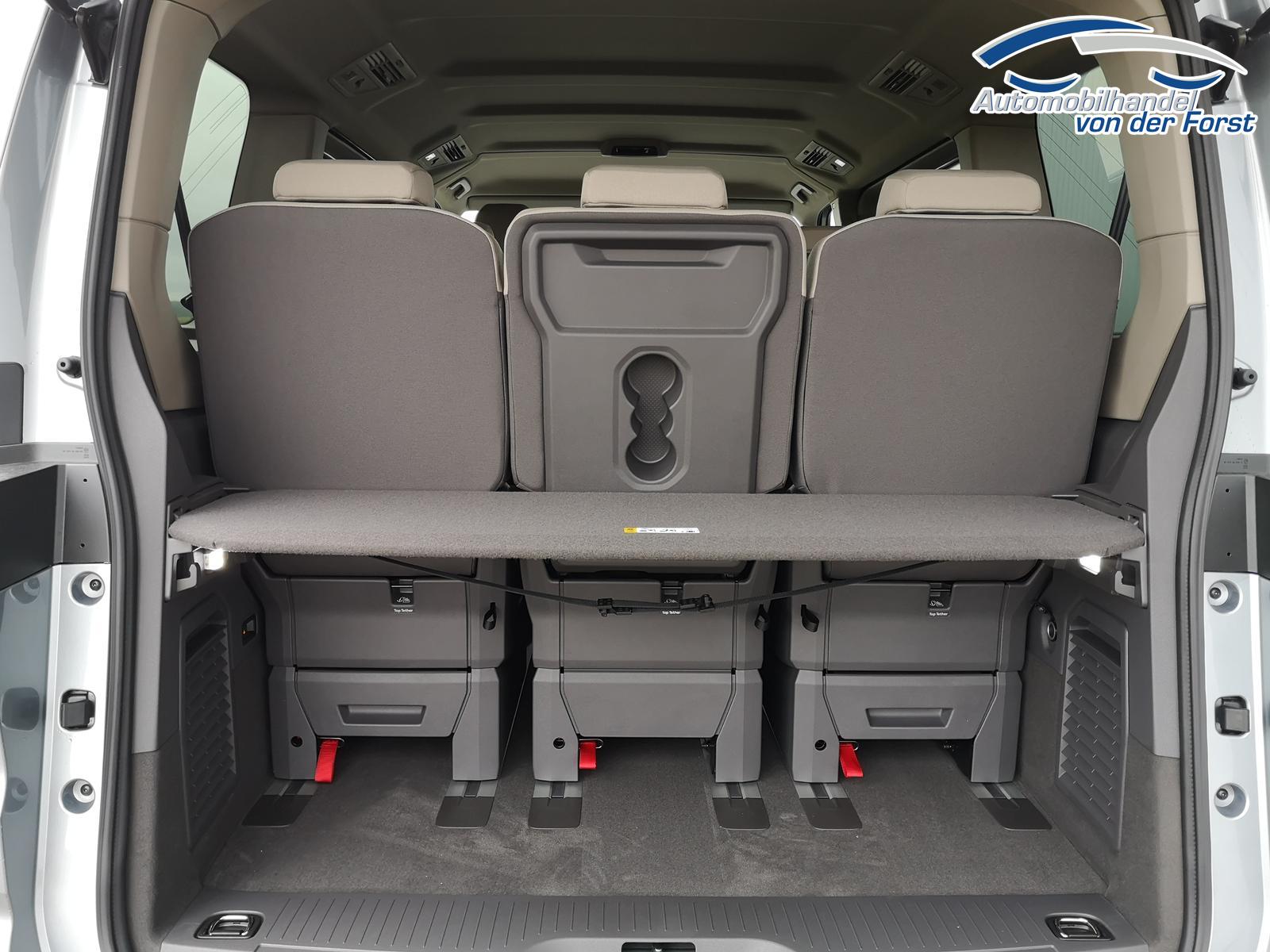 (4A3) Sitzheizung vorne, (3U3) Gepäckraumabdeckung, Belastbarkeit 20 kg inkl. Taschenhaken und Gepäcknet, (4S1) Sitz Fahrer/Beifahrer mit Armlehnen beidseitig inkl. elektrischer Lendenwirbelstütze und Klapptisch auf der Sitzrückseite, (0NP) Bulliplakette am Kotflügel, (U9E) USB Schnistellen 2x vorne und 4x hinten, (Z2Q) Anhängerrangierassistent ""Trailer Assistent"" inkl. Anhängerkupplung schwenkbar, Parklenkassistent inkl. Rückfahrkamera, (Z3A) Family-Paket: Schubladen unter den Sitzen im Fahrgastraum und 2 Abfallbehälter, Multifunktionstisch/Mittelkonsole, Schiebefenster in der Schiebetüre links und rechts, (7UY) Radio Navigationssystem Discover Pro, (4GX) Frontscheibe beheizbar und geräuschdämmend, (7J2) Digitalcockpit Pro, (9IJ) Mobiltelefonschnittstelle Comfort mit induktiver Ladefunktion, (ZEB) Heckklappe elektrisch öffnend und schließend, (6I6) Travelassistent, (2H5) Fahrprofilauswahl, (4K5) Zentralverriegelung Keyless Advance (schlüsselloses Öffnen und Starten), (7AL) Diebstahlwarnanlage, (7VL) Warmwasserstandheizung im Fahrerhaus inkl. Funkfernbedienung, (PT3) Easy Open Paket: Schiebetüren elektrisch inkl. Easy Open Funktion sowie Easy Open Funktion für die Heckklappe, (KS1) Head UP Display, (Z2H) TOP-Paket inkl. Panoramaglasdach, LED-Rüchleuchten abgedunkelt, (ZBR) 7 Sitzer: Sitzvariante 2-2-3 (Vis-a-Vis entgegen der Fahrrichtung) inkl. 4 Armlehnen.